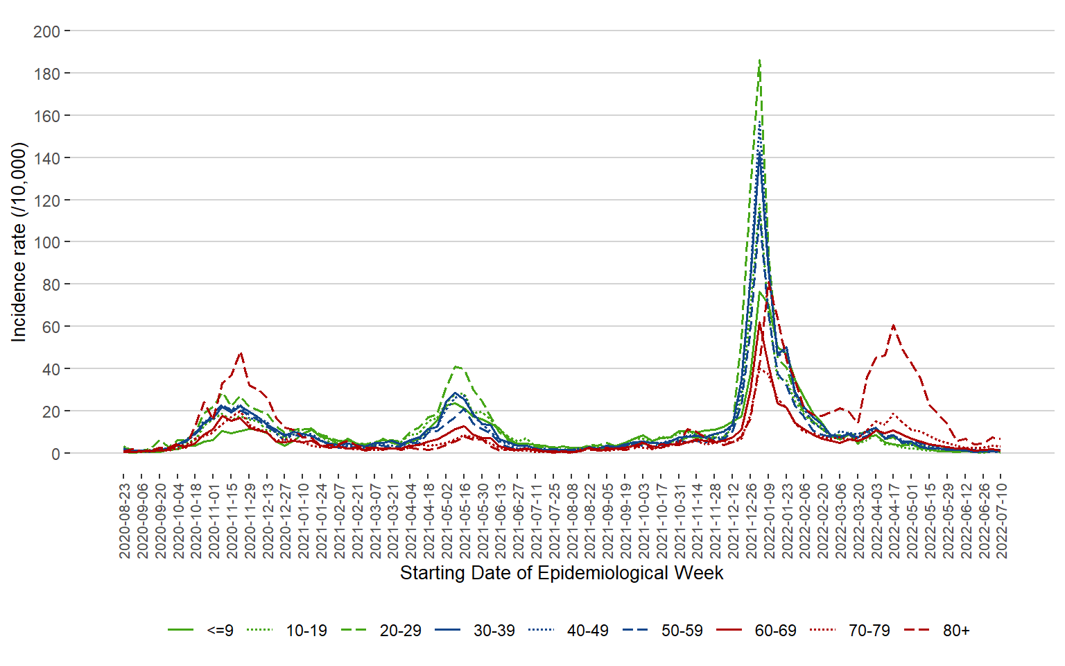 Figure 3. Incidence Rate (/10,000 Population) of COVID-19 Cases by Age Group and Week of Public Health Report Date, Manitoba, August 23, 2020 – July 16, 2022