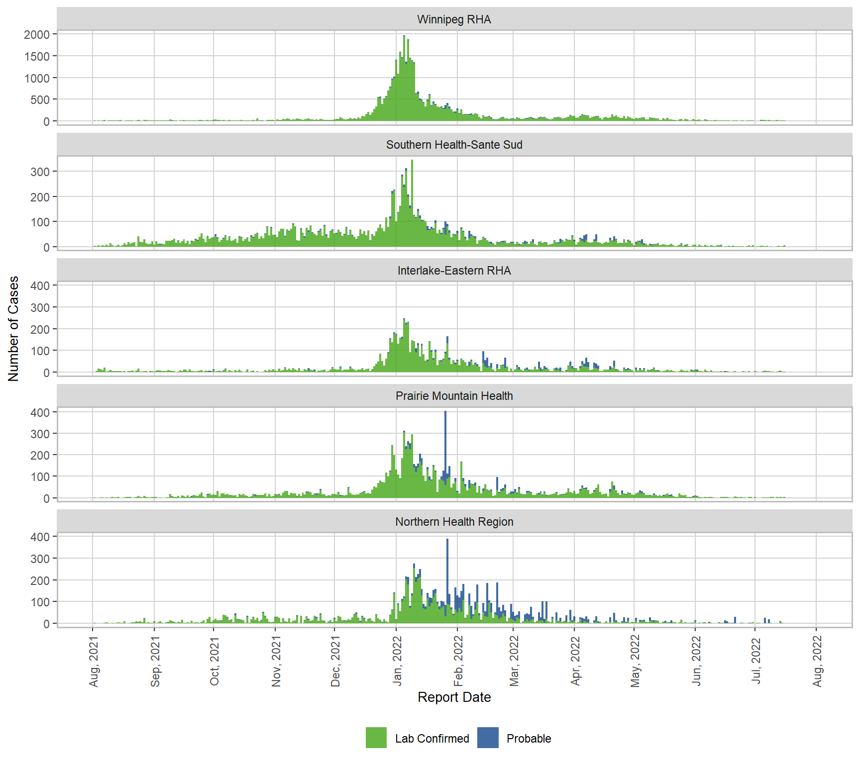 Figure 4. Cases of COVID-19 by Health Region and Public Health Report Date, Manitoba, August 1, 2021 – July 16, 2022