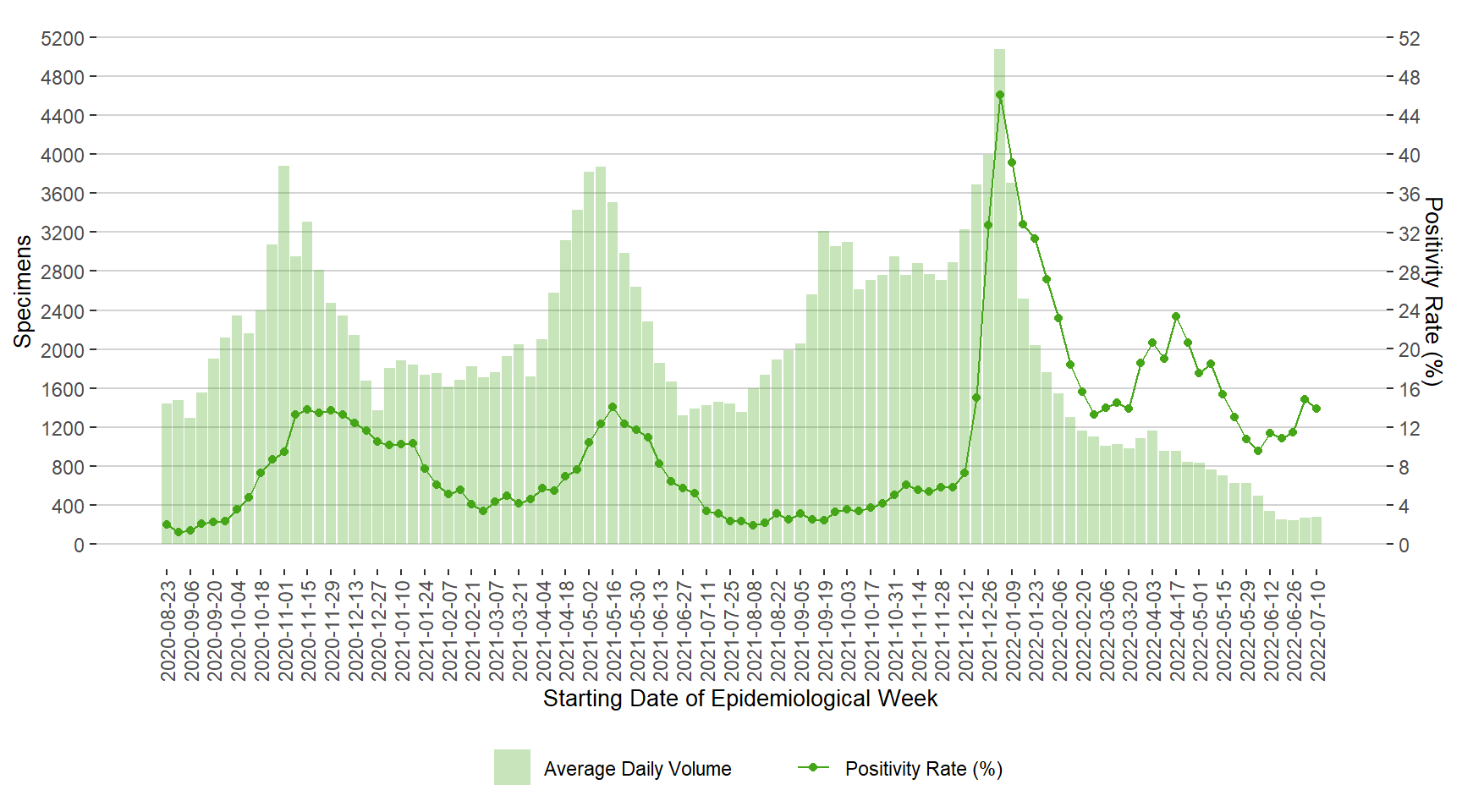 Figure 7. Average Daily Testing Volume and Positivity (%) for COVID-19 by Week of Specimen Receiving Date, Manitoba, August 23, 2020 – July 16, 2022