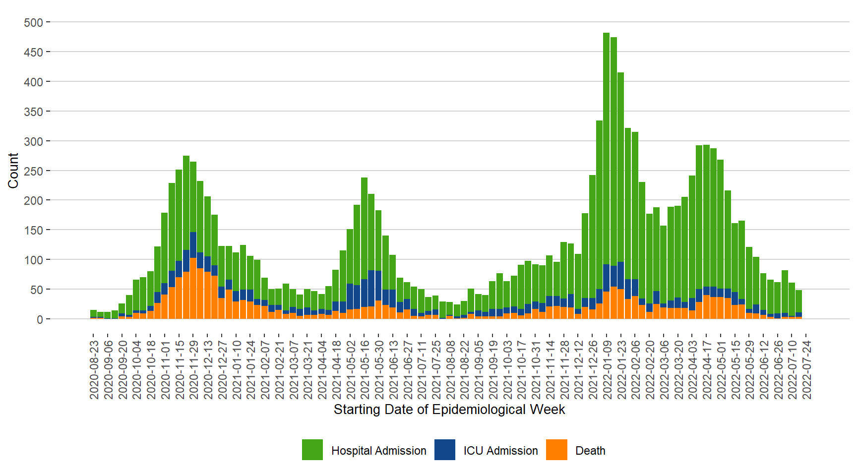 Figure 8. Severe Outcomes of COVID-19 by Week of Outcome Date, Manitoba, August 23, 2020 – July 23, 2022
