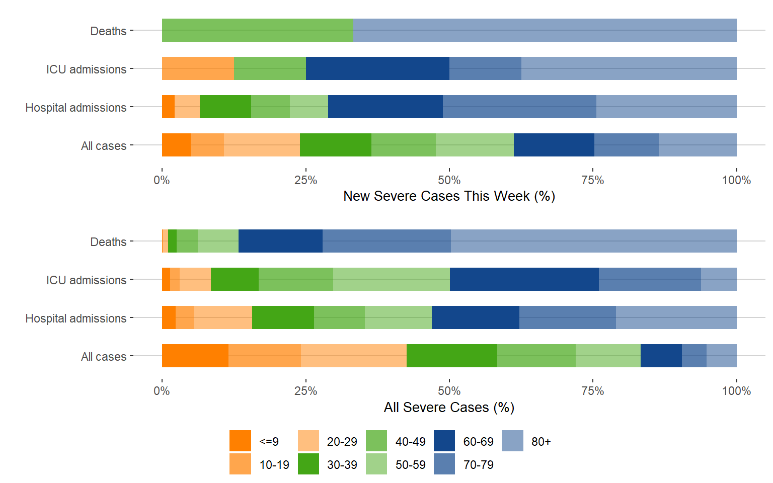 Figure 9. Age Distribution of Severe COVID-19 Cases Compared to All Cases, Manitoba, March 13, 2020 – July 23, 2022