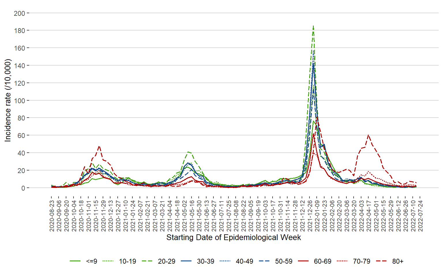 Figure 3. Incidence Rate (/10,000 Population) of COVID-19 Cases by Age Group and Week of Public Health Report Date, Manitoba, August 23, 2020 – July 23, 2022