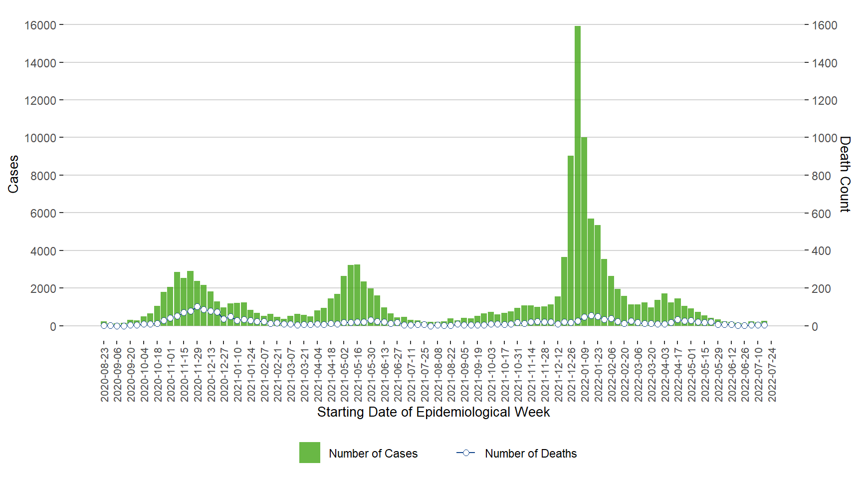 Figure 1. Cases of COVID-19 by Week of Public Health Report Date, Manitoba, August 23, 2020 – July 23, 2022