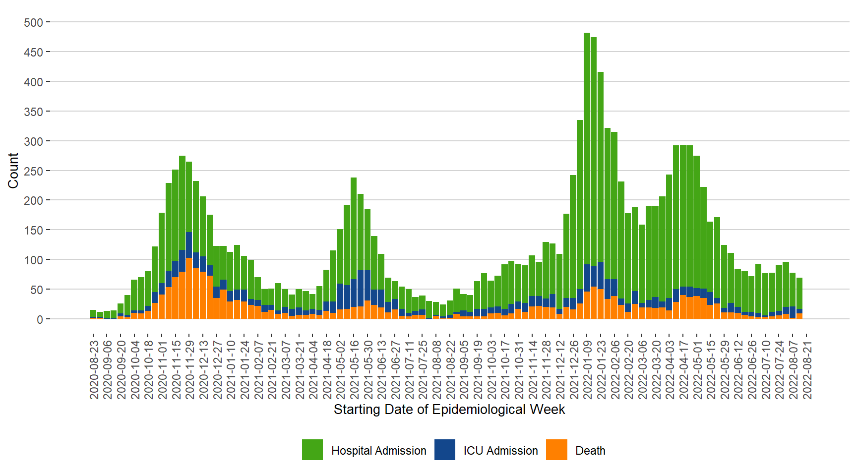 Figure 6. Severe Outcomes of COVID-19 by Week of Outcome Date, Manitoba, August 23, 2020 – August 20, 2022