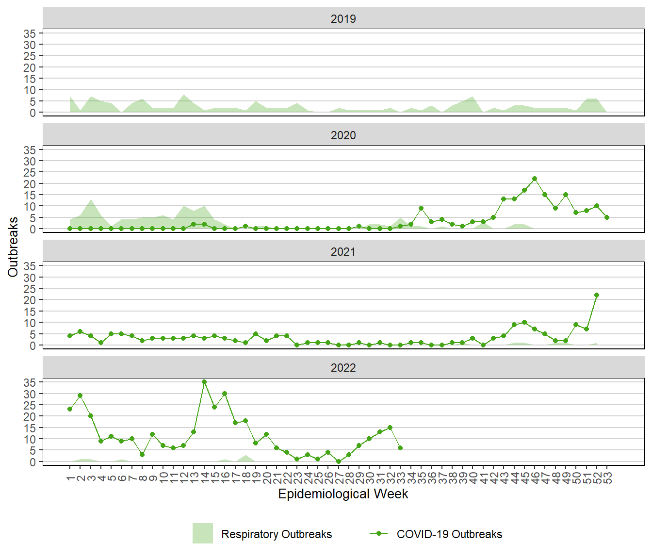 Figure 9. Weekly COVID-19 Outbreaks, Manitoba, 2019 – 2022