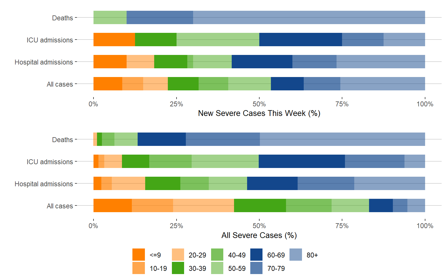 Severe outcomes associated with COVID-19 infection decreased compared to the previous week. There were 60 hospital admissions including 8 ICU admissions, and 9 deaths.
