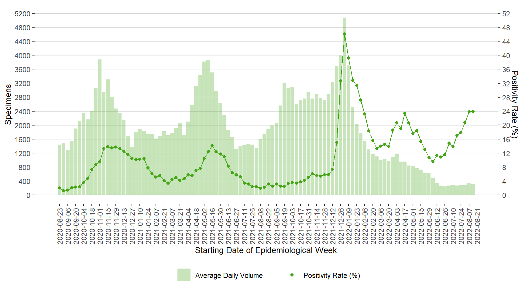 Figure 5. Average Daily Testing Volume and Positivity (%) for COVID-19 by Week of Specimen Receiving Date, Manitoba, August 23, 2020 – August 20, 2022