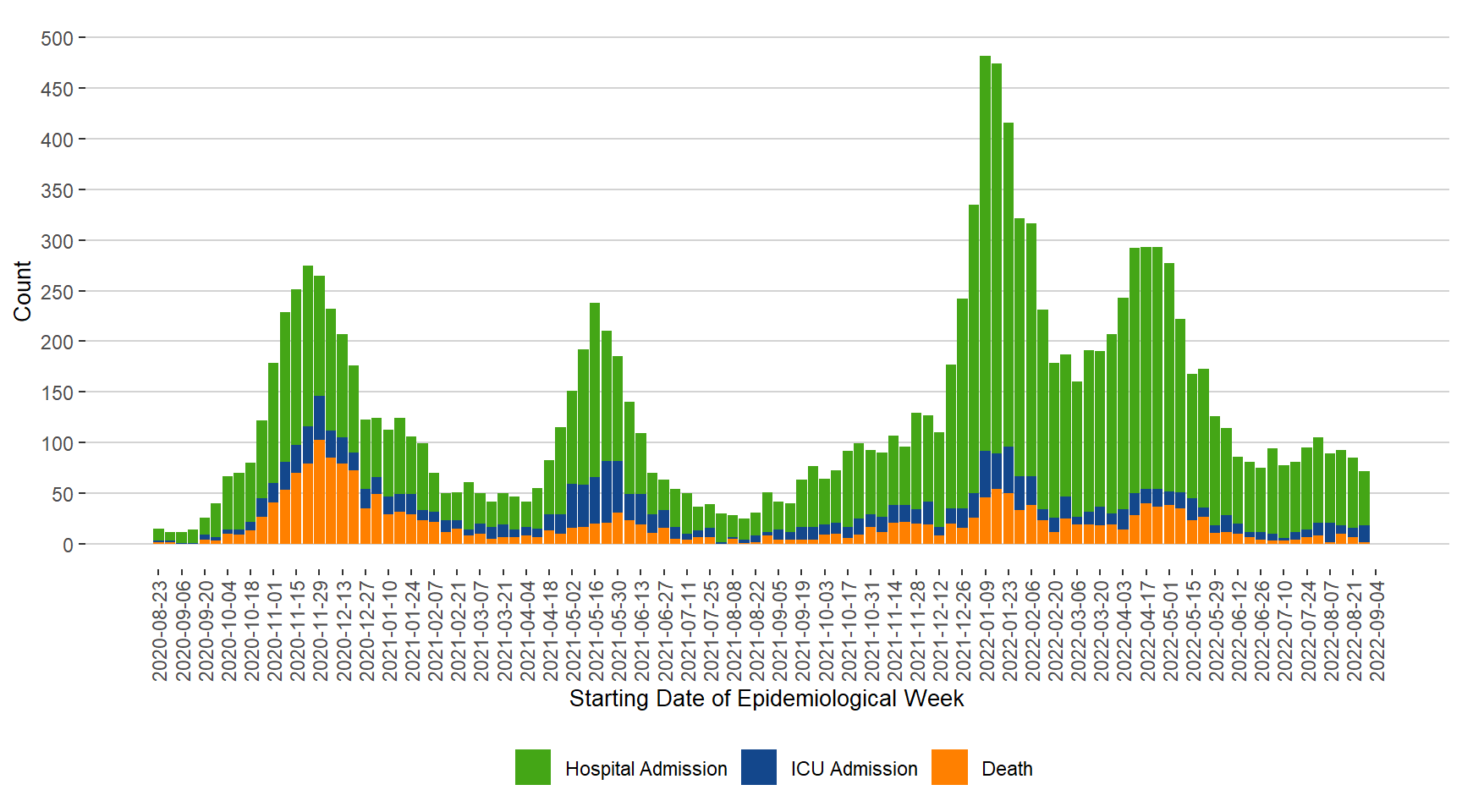 Figure 6. Severe Outcomes of COVID-19 by Week of Outcome Date, Manitoba, August 23, 2020 – September 3, 2022