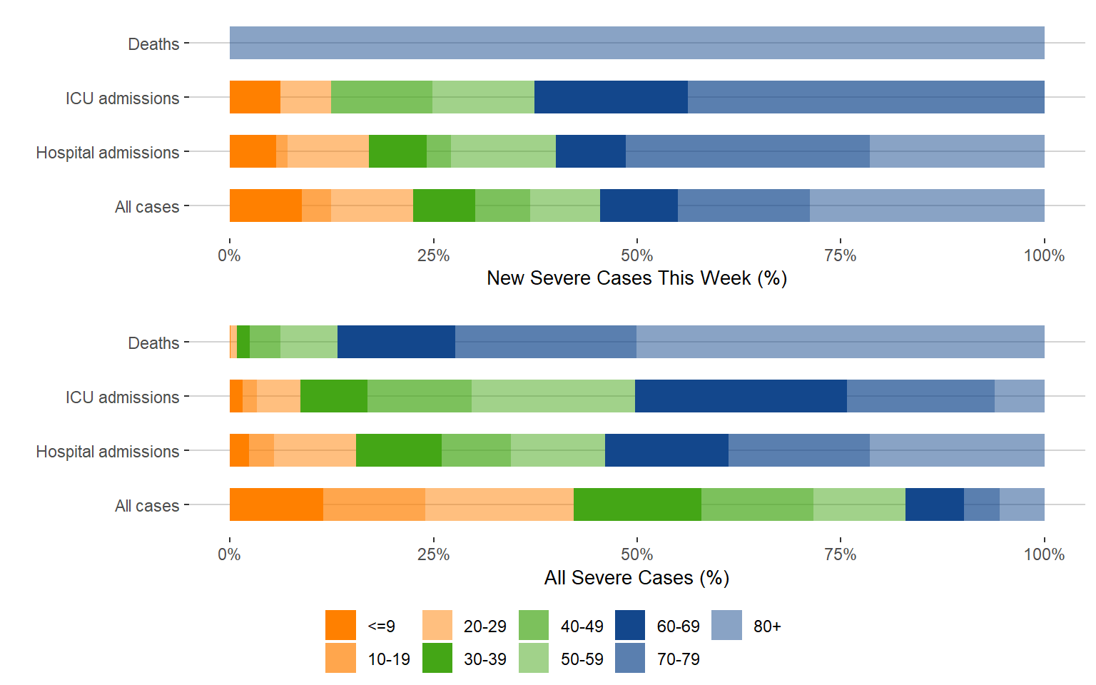 Figure 7. Age Distribution of Severe COVID-19 Cases Compared to All Cases, Manitoba, March 13, 2020 – September 3, 2022