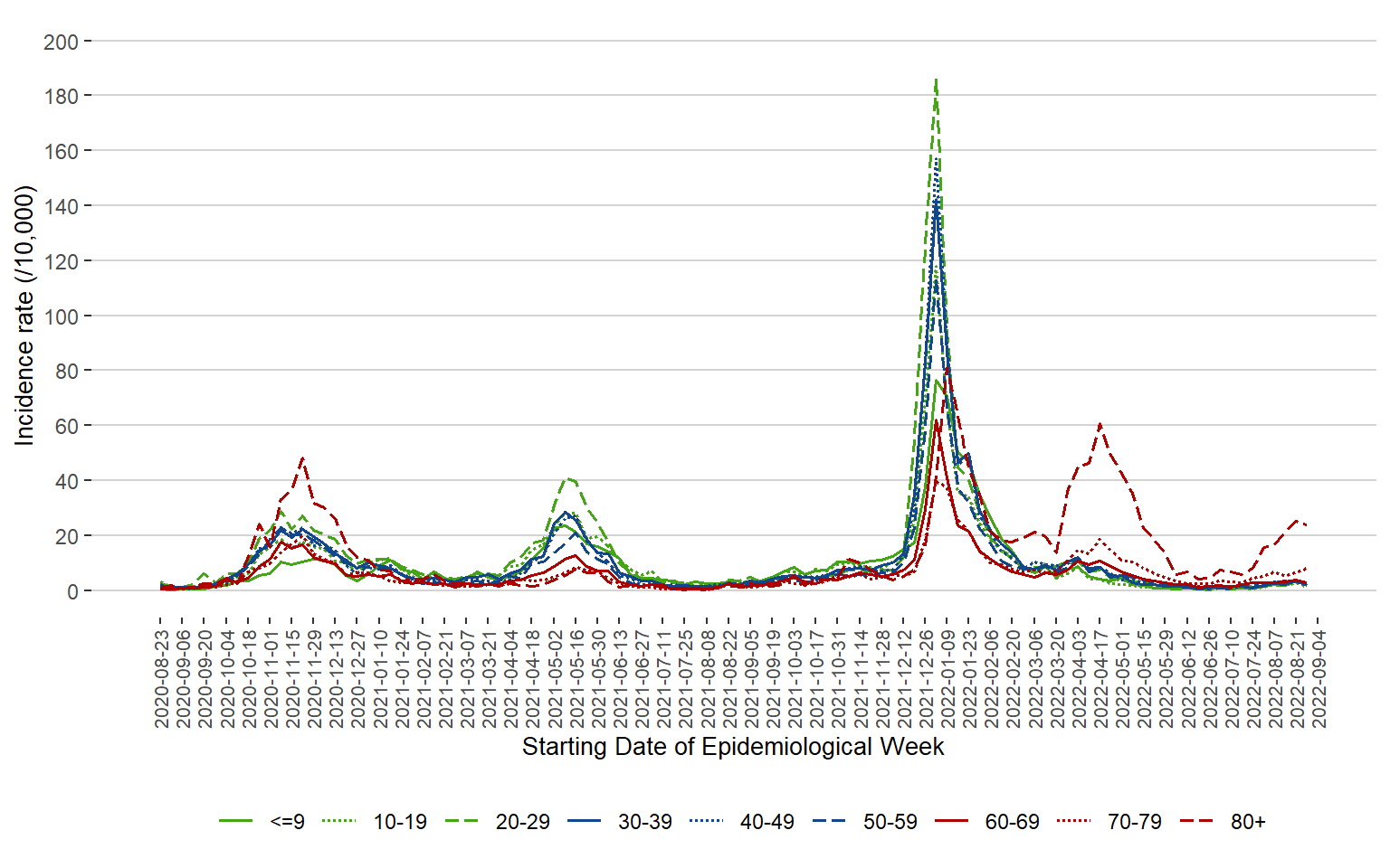 Figure 3. Incidence Rate (/10,000 Population) of COVID-19 Cases by Age Group and Week of Public Health Report Date, Manitoba, August 23, 2020 – September 3, 2022