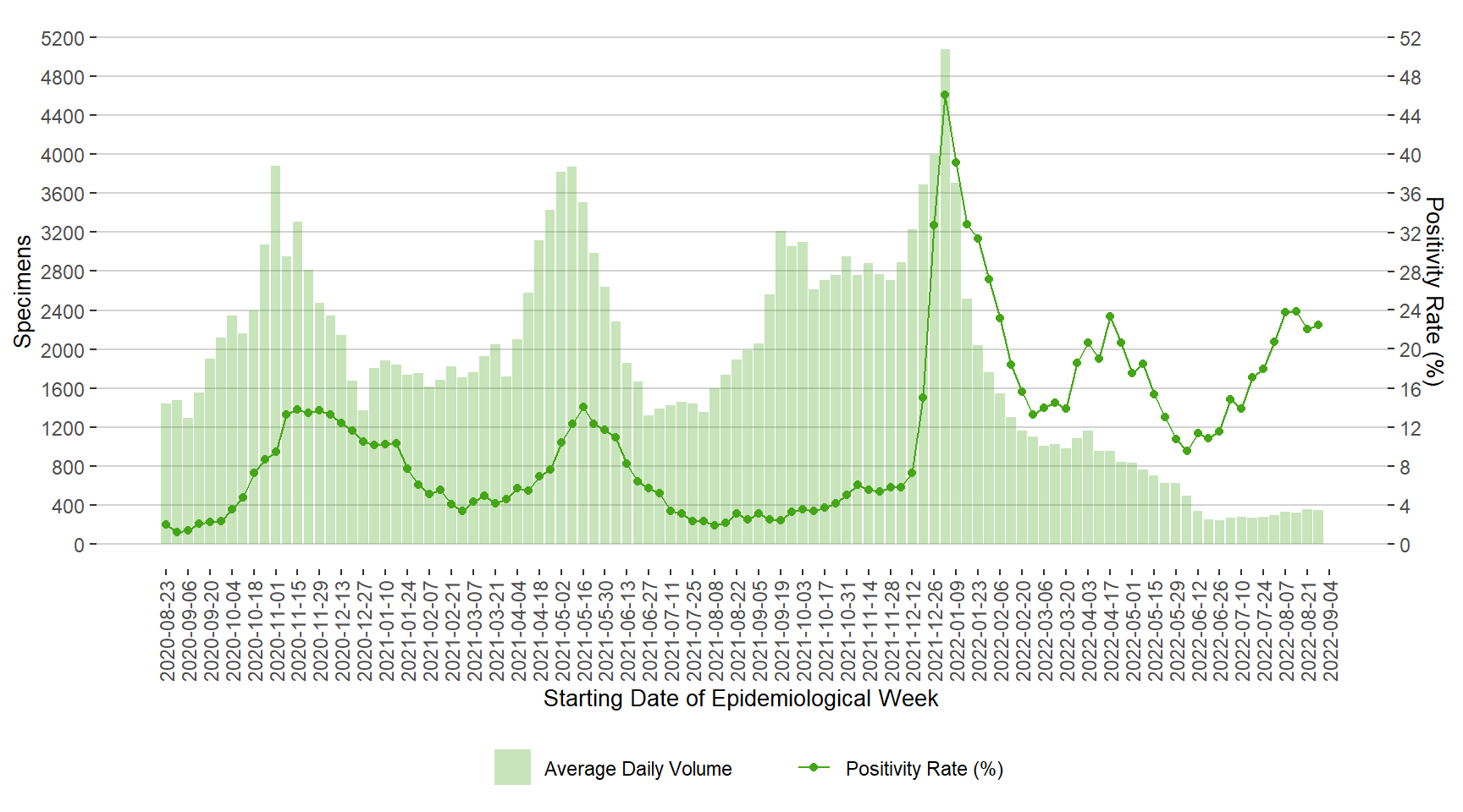 Figure 5. Average Daily Testing Volume and Positivity (%) for COVID-19 by Week of Specimen Receiving Date, Manitoba, August 23, 2020 – September 3, 2022
