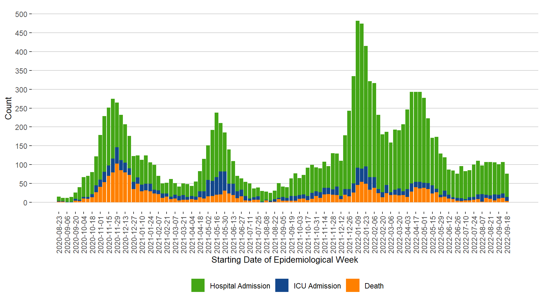 Figure 6. Severe Outcomes of COVID-19 by Week of Outcome Date, Manitoba, August 23, 2020 – September 24, 2022