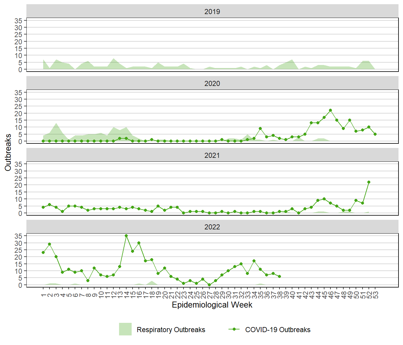 Figure 9. Weekly COVID-19 Outbreaks, Manitoba, 2019 – 2022