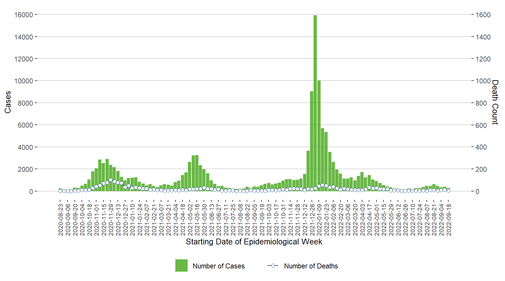 Figure 1. Cases of COVID-19 by Week of Public Health Report Date, Manitoba, August 23, 2020 – September 24, 2022