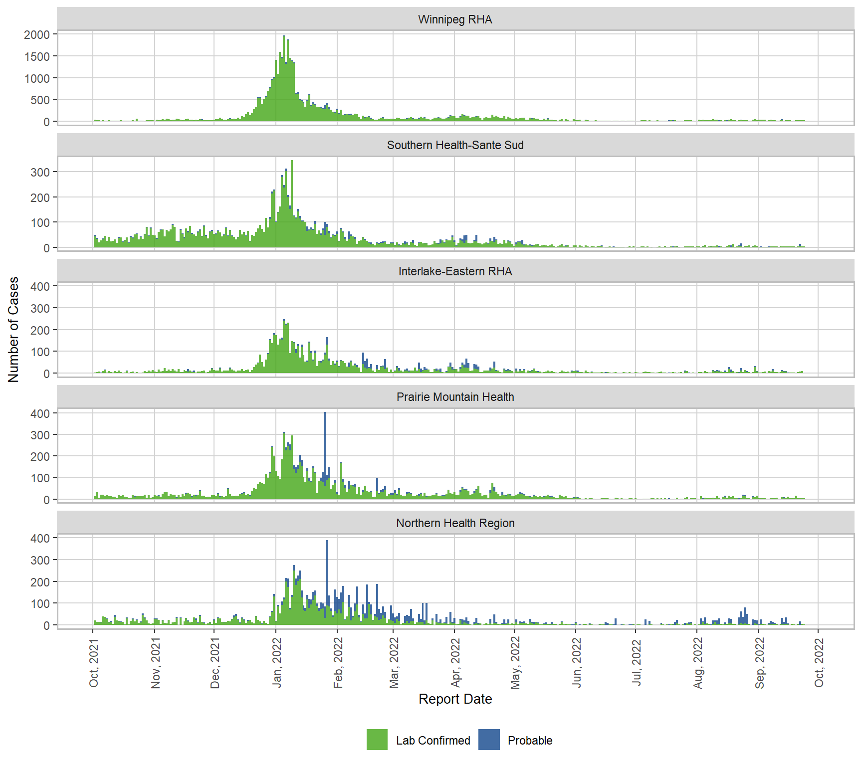 Figure 4. Cases of COVID-19 by Health Region and Public Health Report Date, Manitoba, October 1, 2021 – September 24, 2022