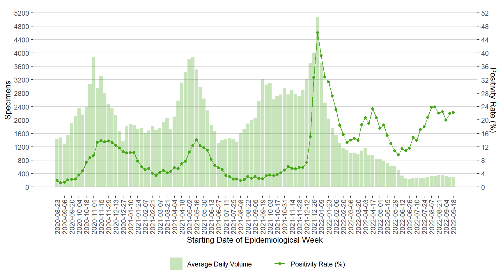 Figure 5. Average Daily Testing Volume and Positivity (%) for COVID-19 by Week of Specimen Receiving Date, Manitoba, August 23, 2020 – September 24, 2022