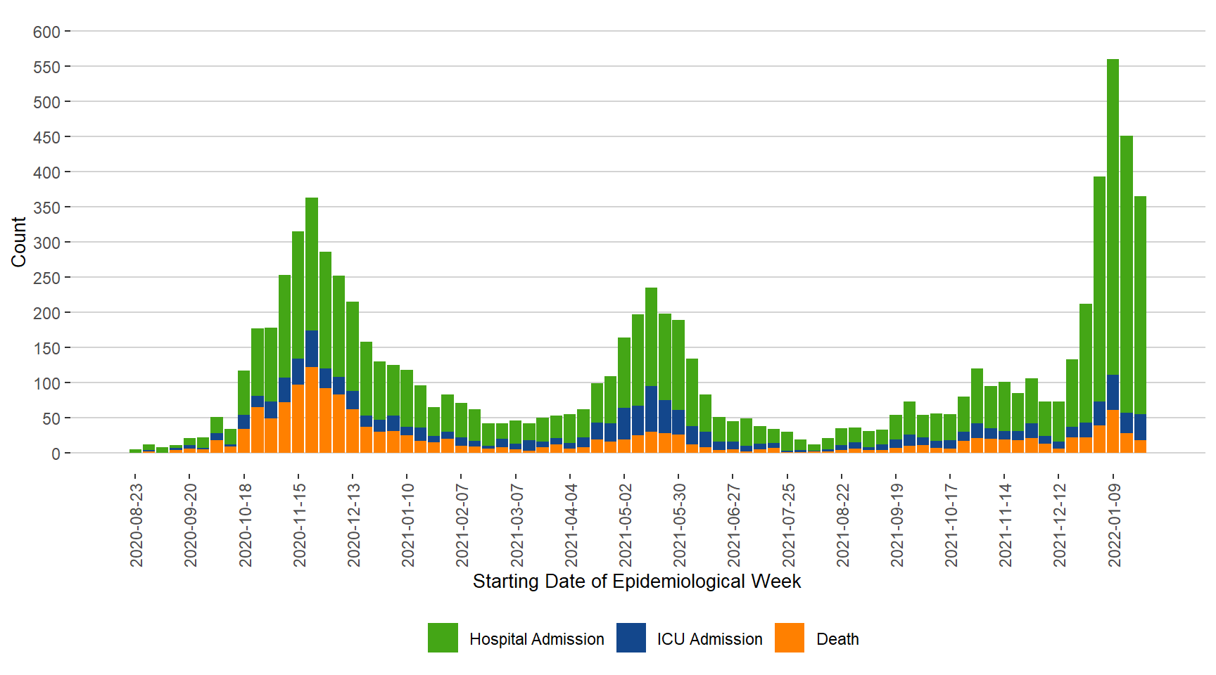 Figure 7. Severe Outcomes of COVID-19 by Week of Public Health Report Date, Manitoba, August 23, 2020 – January 29, 2022