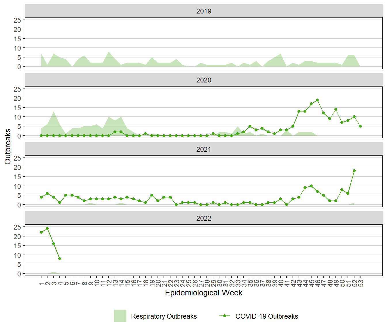 Figure 10. Weekly COVID-19 Outbreaks, Manitoba, 2018 – 2022