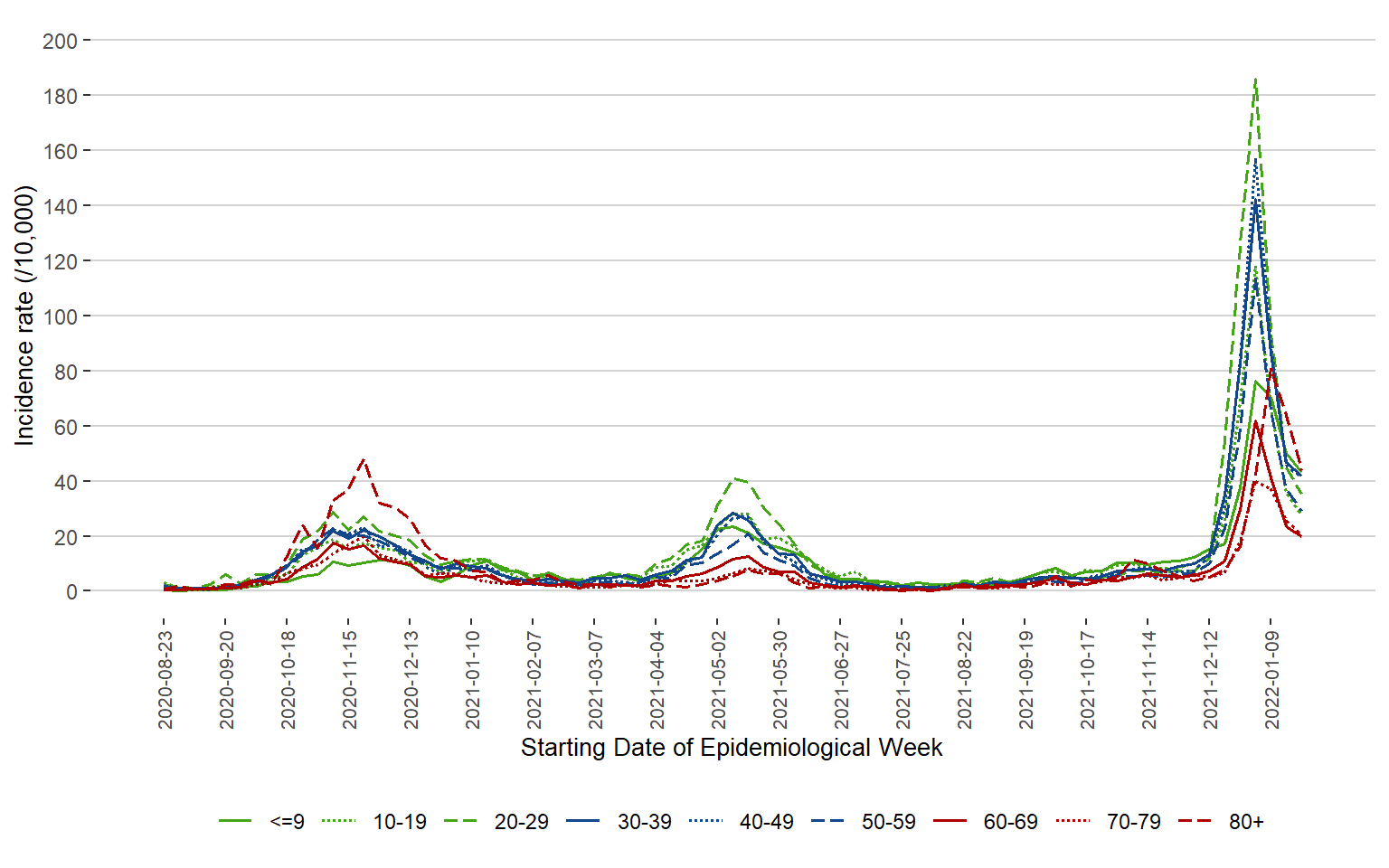 Back Figure 3. Incidence Rate (/10,000 Population) of COVID-19 Cases by Age Group and Week of Public Health Report Date, Manitoba, August 23, 2020 – January 29, 2022
