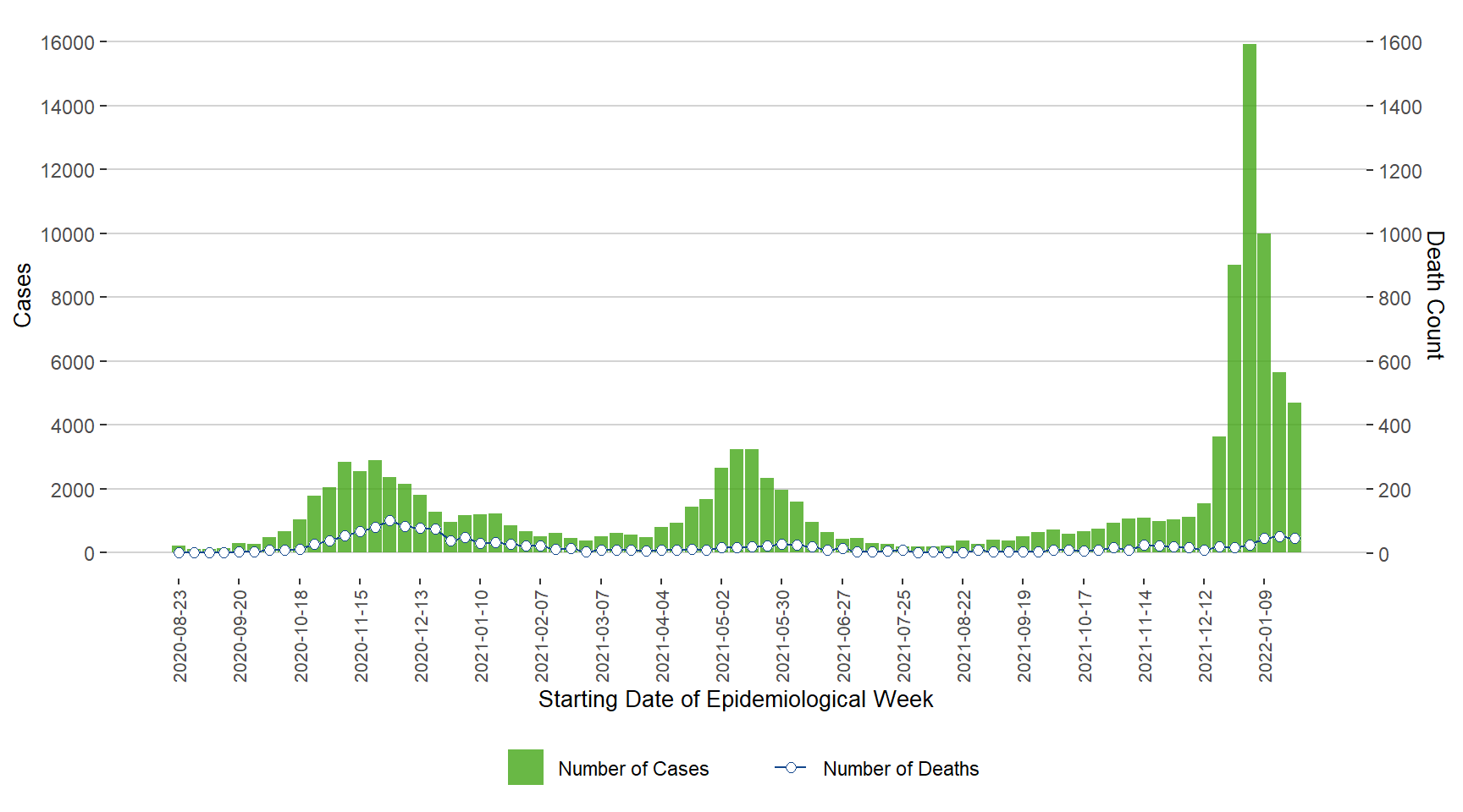 Figure 1. Cases of COVID-19 by Week of Public Health Report Date, Manitoba, August 23, 2020 – January 29, 2022