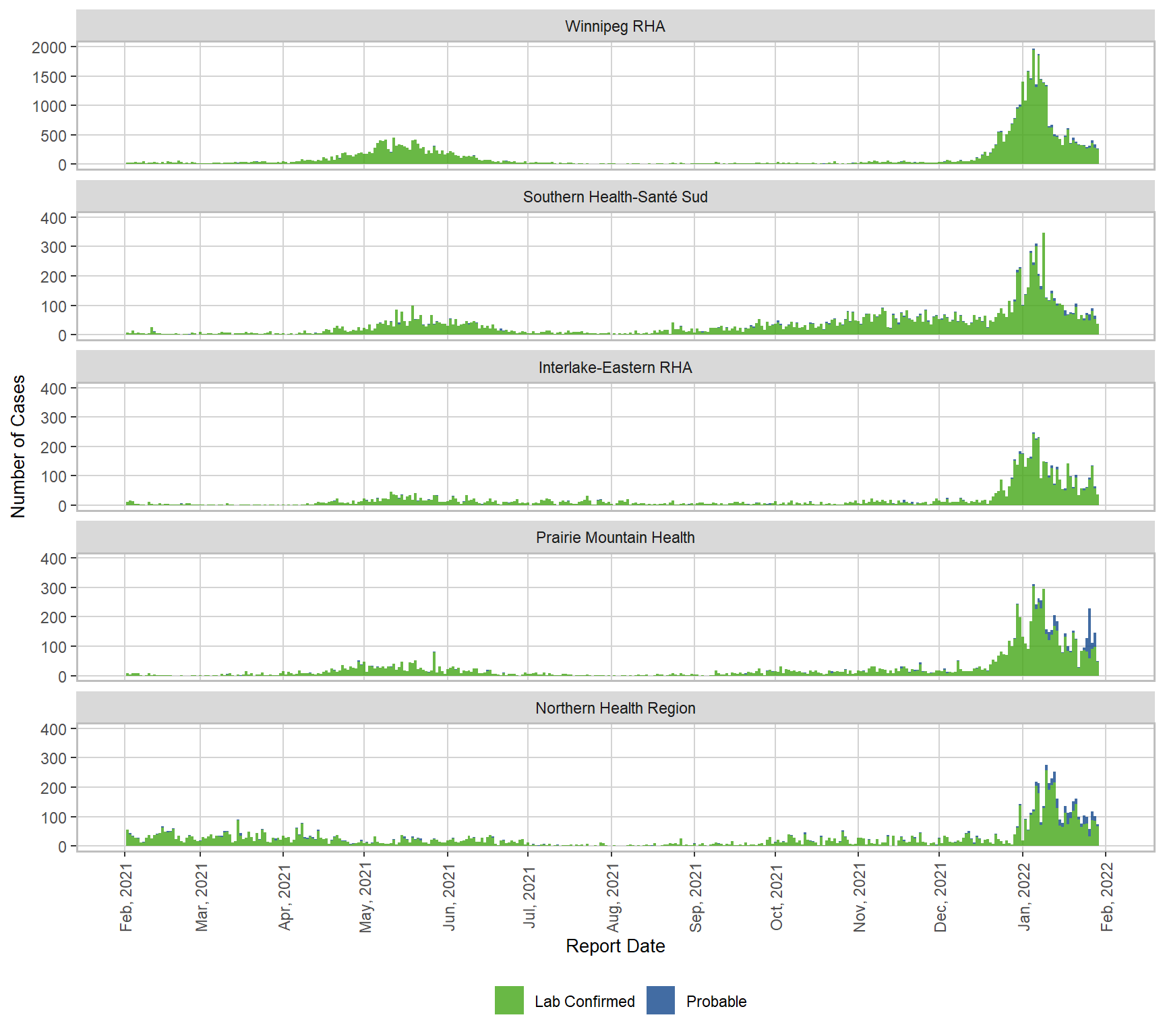 Back Figure 4. Cases of COVID-19 by Health Region and Public Health Report Date, Manitoba, February 1, 2021 – January 29, 2022