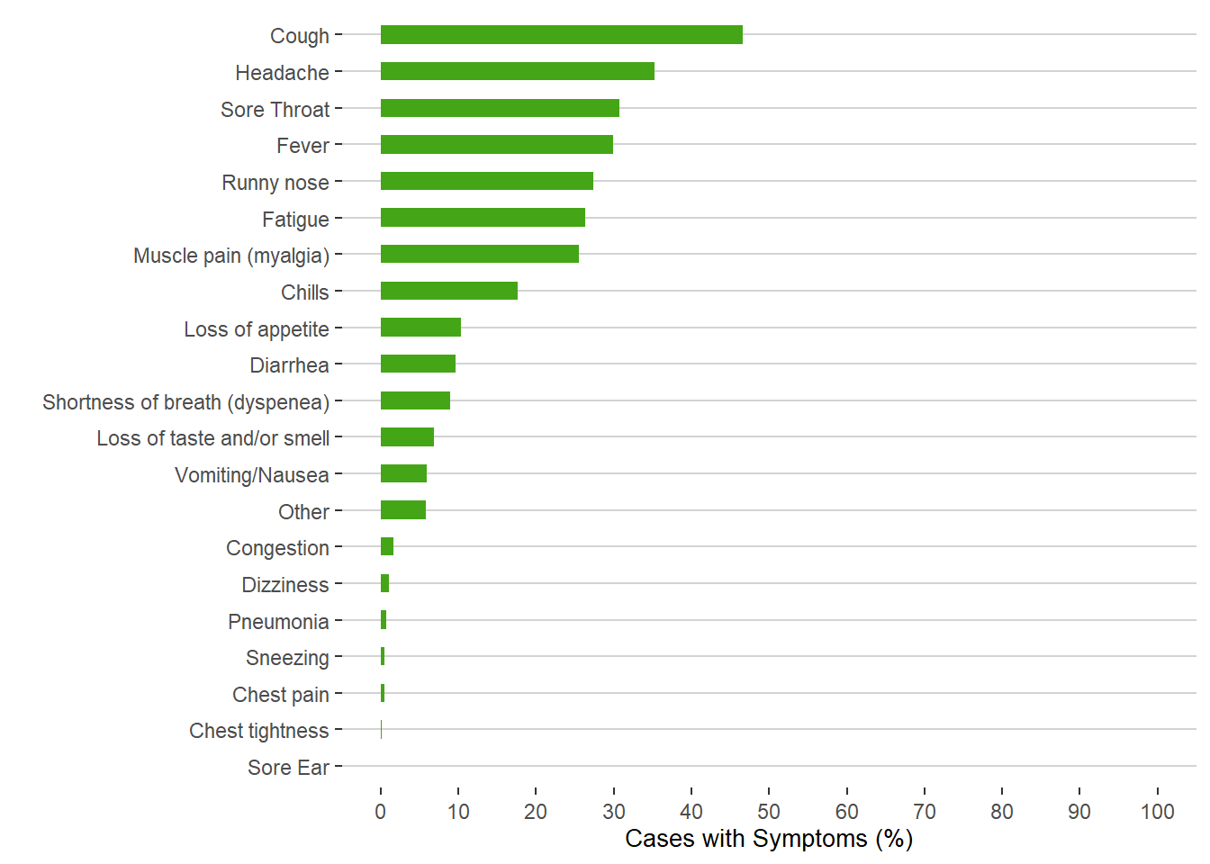Figure 11. Percentage of Symptoms Reported by COVID-19 Cases, Manitoba, March 13, 2020 – January 29, 2022