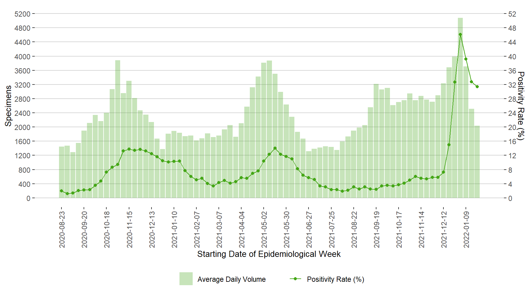 Figure 6. Average Daily Testing Volume and Positivity (%) for COVID-19 by Week of Specimen Receiving Date, Manitoba, August 23, 2020 – January 29, 2022