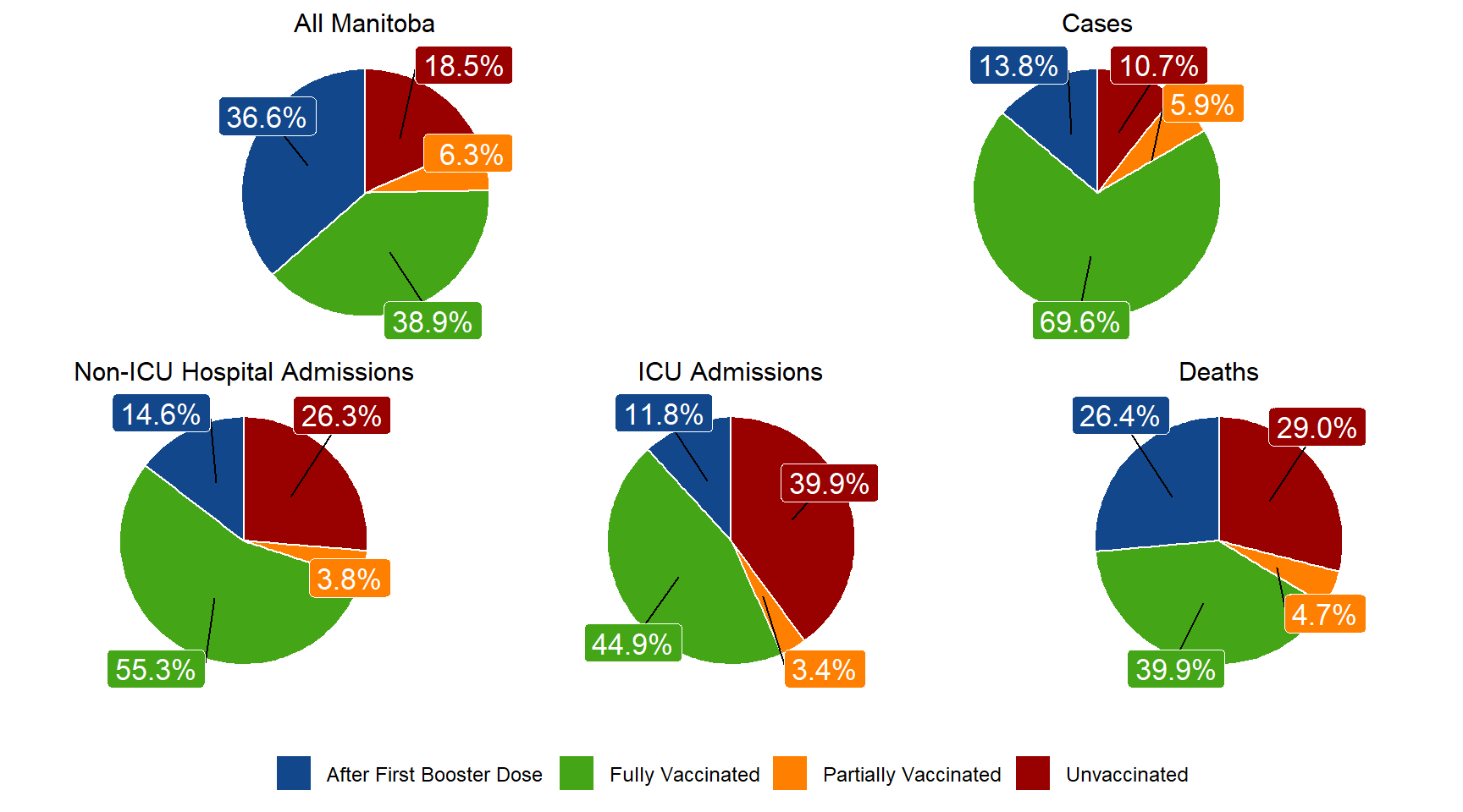 BackFigure 5. Vaccination Status in Monthly New Cases, Non-ICU Hospital Admissions, ICU Admissions, and Deaths, Manitoba, December 26, 2021 – January 31, 2022