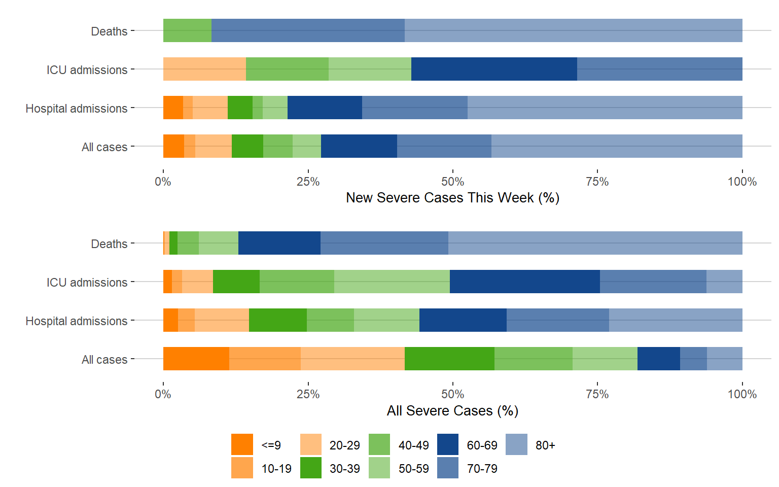 Figure 7. Age Distribution of Severe COVID-19 Cases Compared to All Cases, Manitoba, March 13, 2020 – October 29, 2022