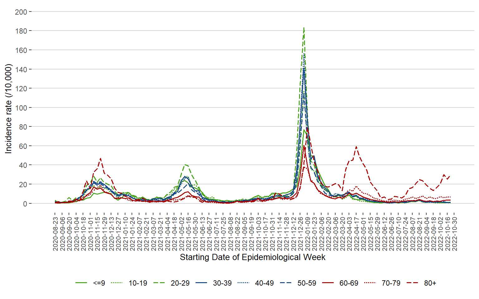 Figure 3. Incidence Rate (/10,000 Population) of COVID-19 Cases by Age Group and Week of Public Health Report Date, Manitoba, August 23, 2020 – October 29, 2022