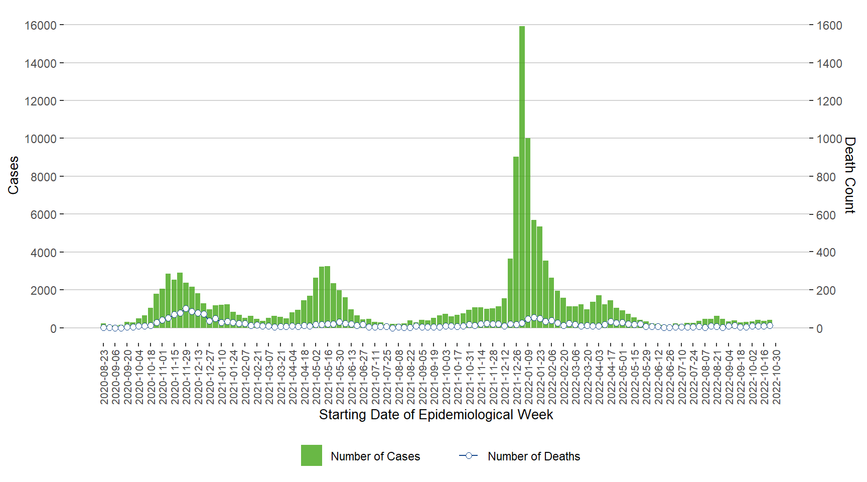 Figure 1. Cases of COVID-19 by Week of Public Health Report Date, Manitoba, August 23, 2020 – October 29, 2022