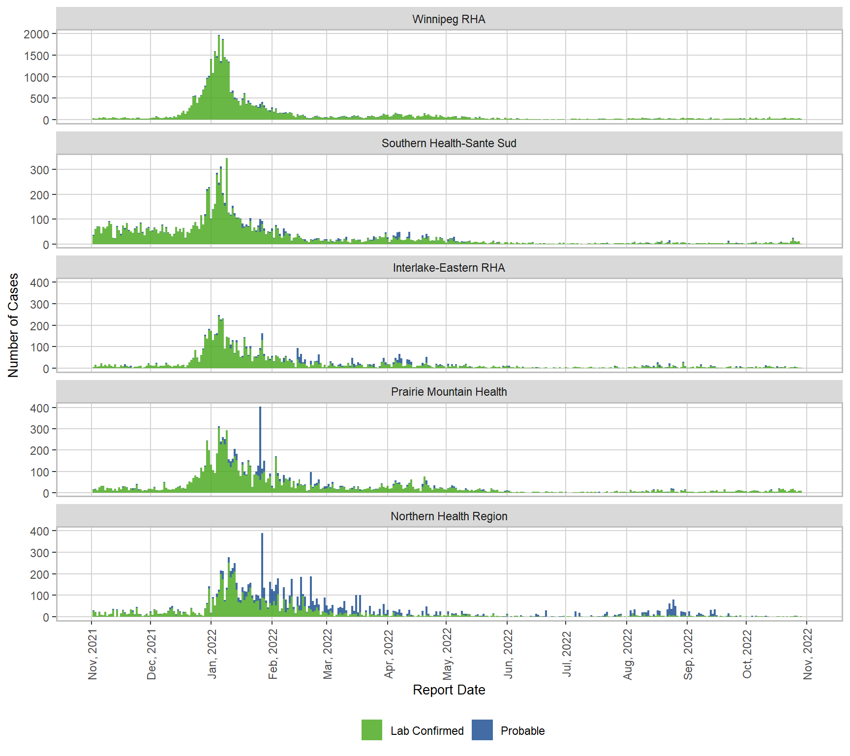 Figure 4. Cases of COVID-19 by Health Region and Public Health Report Date, Manitoba, November 1, 2021 – October 29, 2022