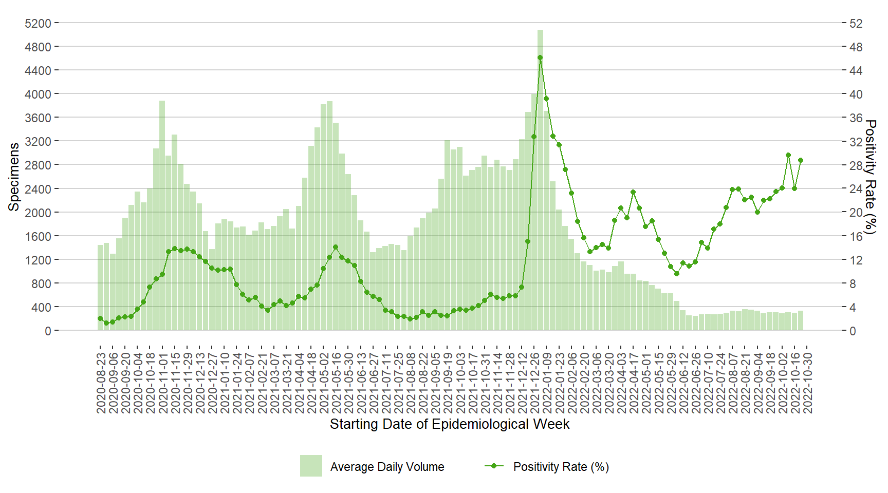 Figure 5. Average Daily Testing Volume and Positivity (%) for COVID-19 by Week of Specimen Receiving Date, Manitoba, August 23, 2020 – October 29, 2022