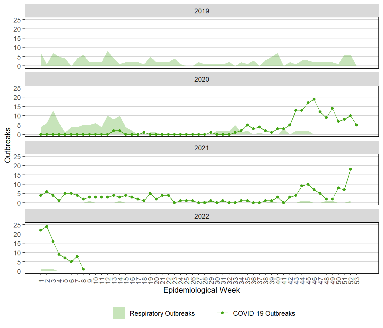Figure 10. Weekly COVID-19 Outbreaks, Manitoba, 2018 – 2022