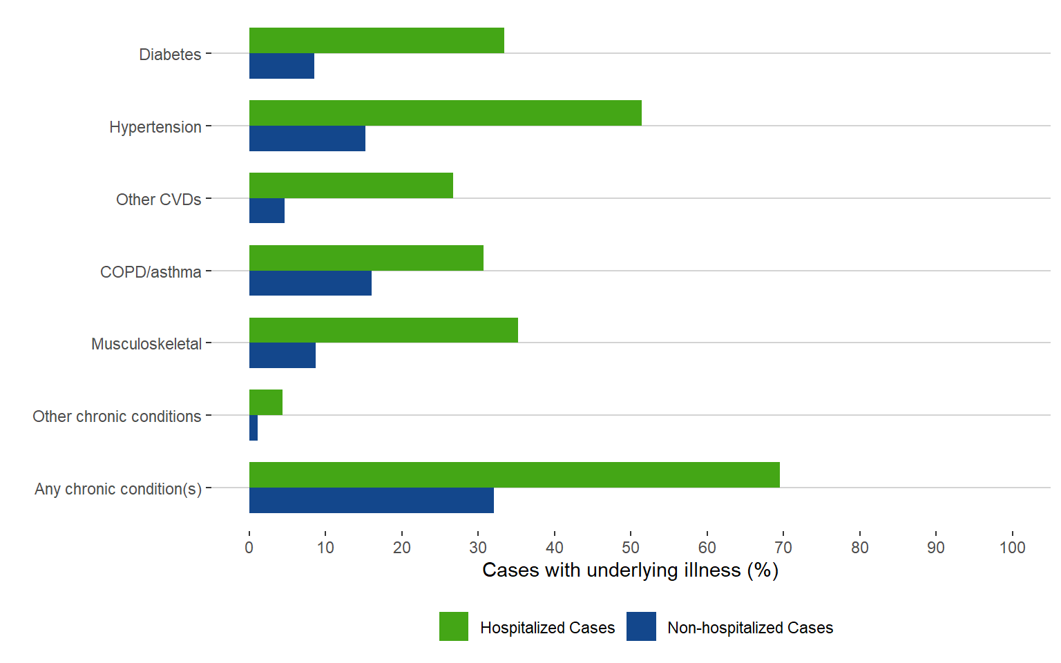 Note. Musculoskeletal illnesses include: osteoporosis, osteoarthritis, juvenile idiopathic arthritis, gout and crystal Arthropathies; COPD-chronic obstructive pulmonary disease; CVD-cardiovascular disease; Other CVDs include: ischemic heart disease, heart failure, acute myocardial infarction, and stroke; Other chronic conditions include: parkinson’s disease, multiple sclerosis, alzheimer’s disease and epilepsy. About definitions of chronic conditions