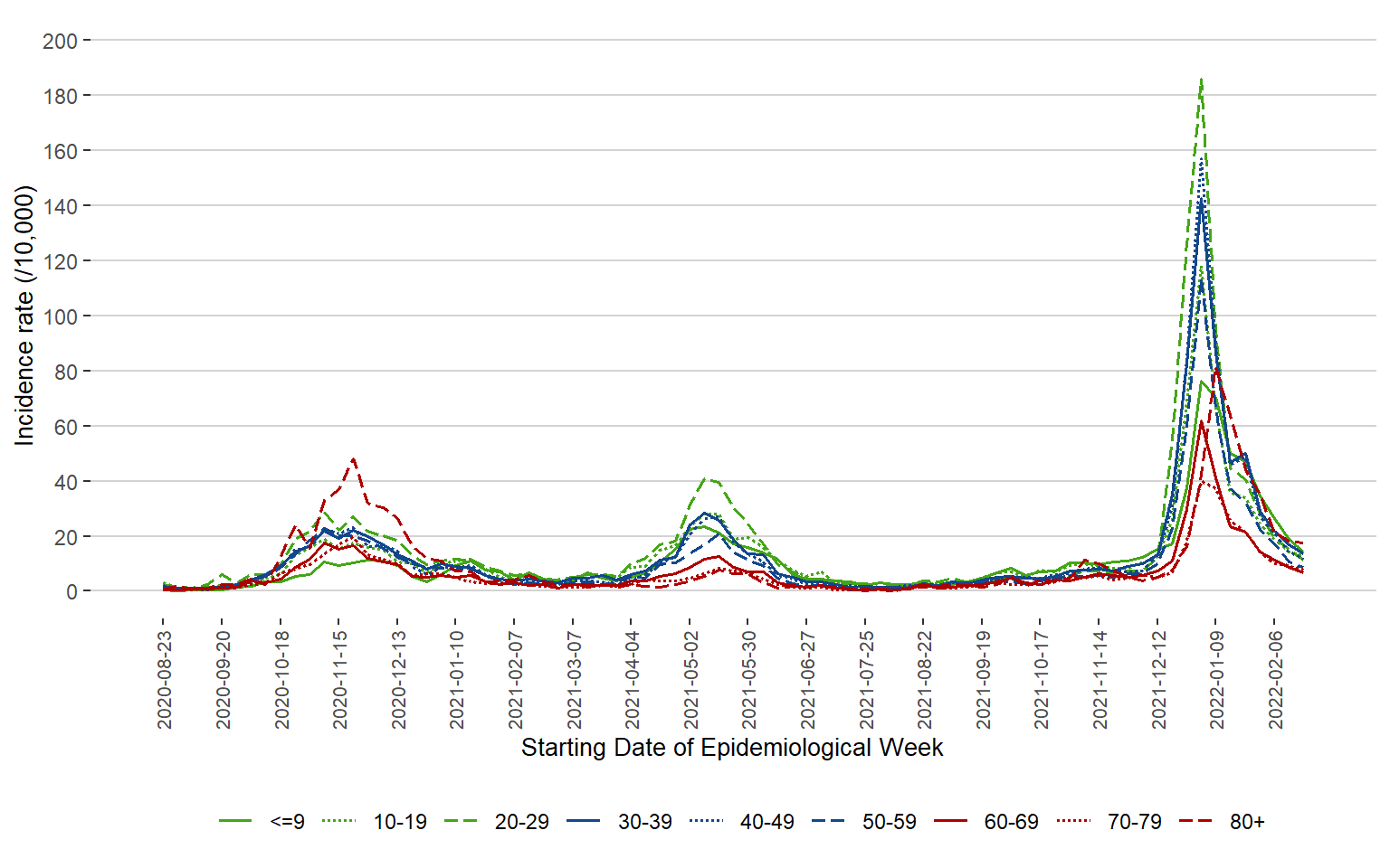 Figure 3. Incidence Rate (/10,000 Population) of COVID-19 Cases by Age Group and Week of Public Health Report Date, Manitoba, August 23, 2020 – February 26, 2022