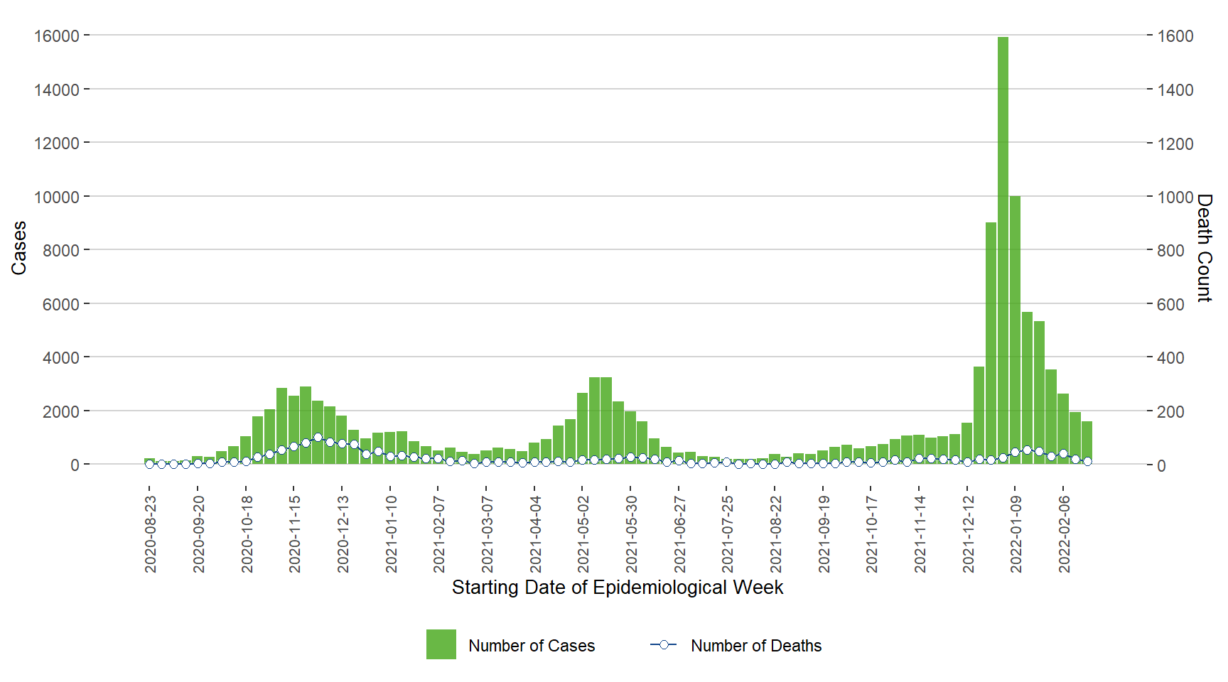 Figure 1. Cases of COVID-19 by Week of Public Health Report Date, Manitoba, August 23, 2020 – February 26, 2022