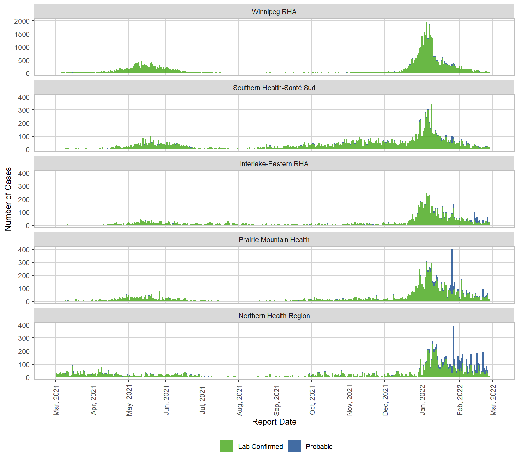 Figure 4. Cases of COVID-19 by Health Region and Public Health Report Date, Manitoba, March 1, 2021 – February 26, 2022