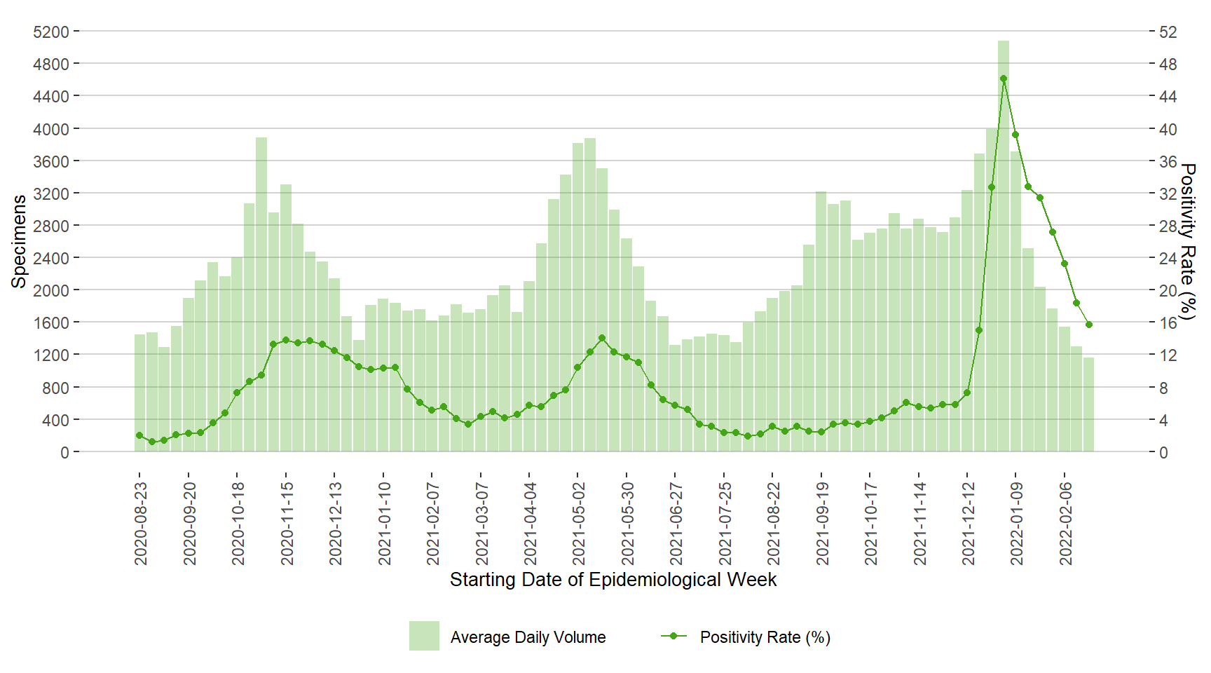 Figure 6. Average Daily Testing Volume and Positivity (%) for COVID-19 by Week of Specimen Receiving Date, Manitoba, August 23, 2020 – February 26, 2022