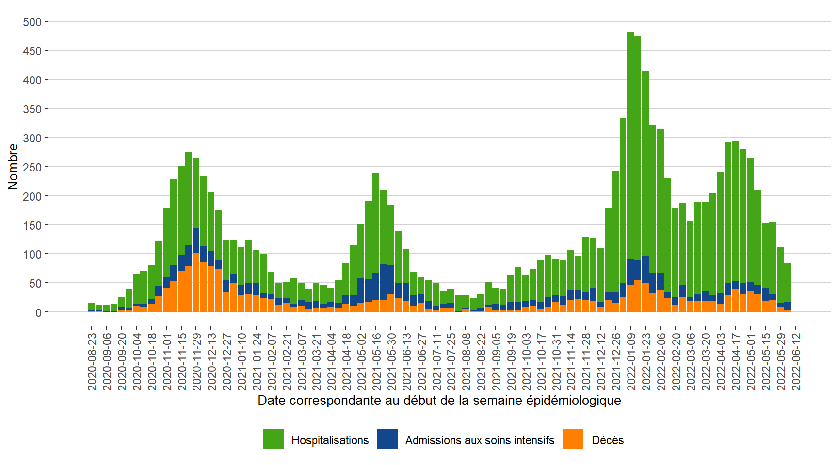 Remarque : Les admissions aux soins intensifs ne sont pas incluses dans les hospitalisations.