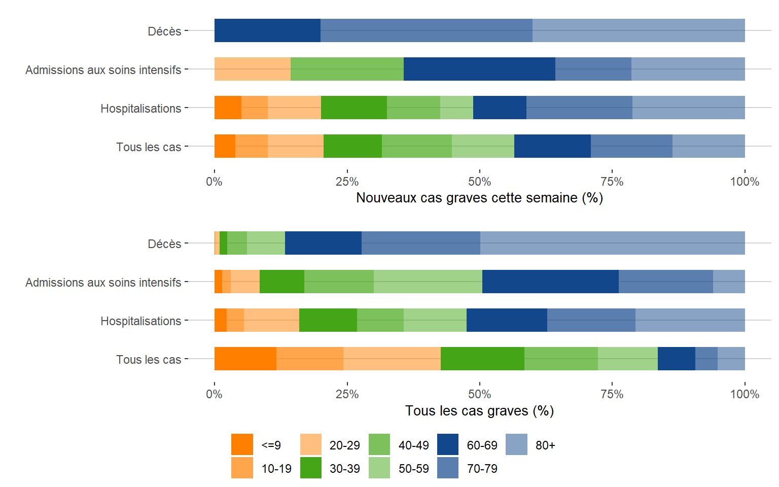 Figure 9. Répartition des cas graves de COVID-19 selon l’âge par rapport à tous les cas au Manitoba du 13 mars 2020 au 11 juin 2022
