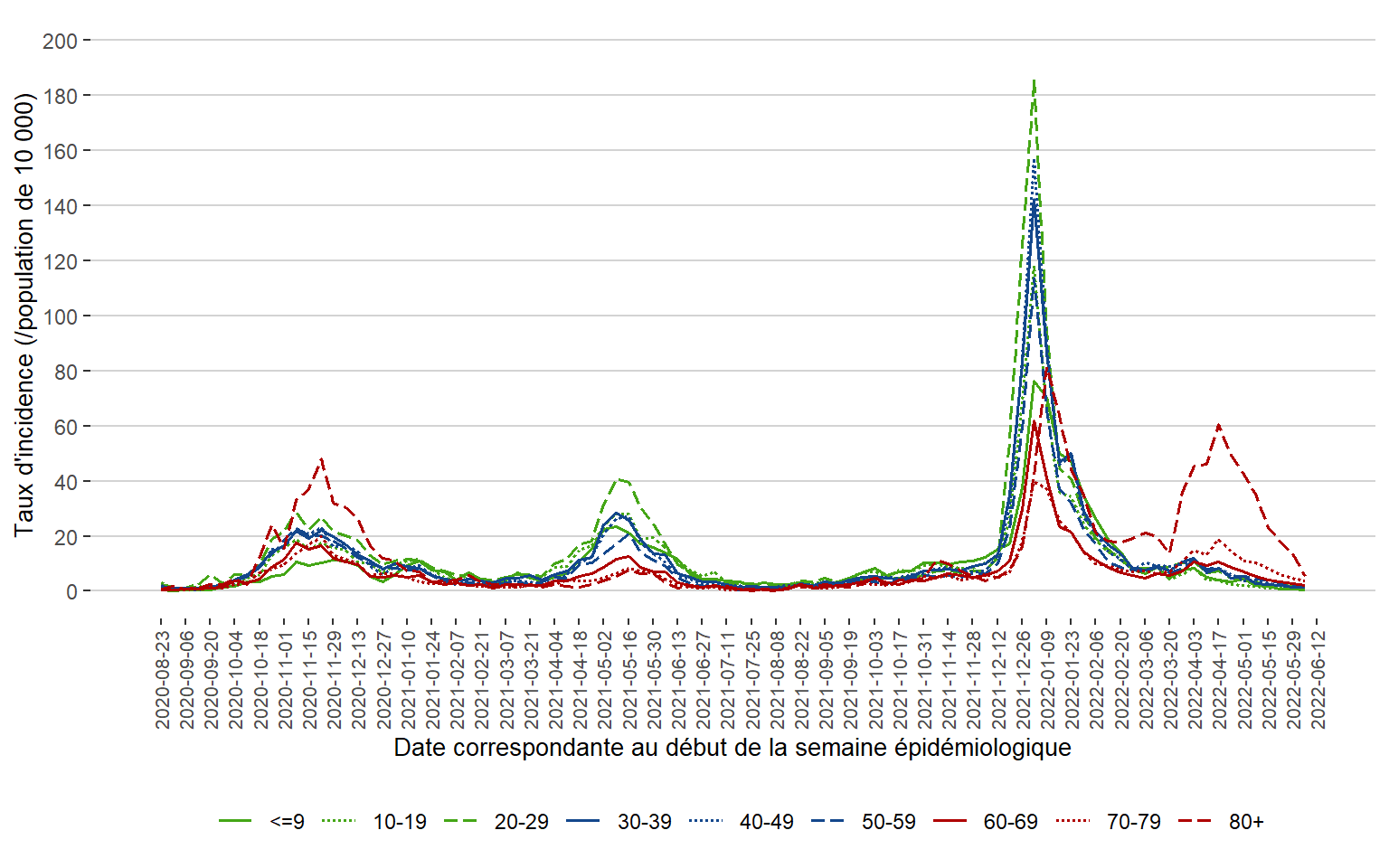 Figure 3. Taux d’incidence (/population de 10 000) des cas de COVID-19 par groupe d’âge et par semaine de date correspondante au rapport de l’office de la santé publique du Manitoba, du 23 août 2020 au 11 juin 2022