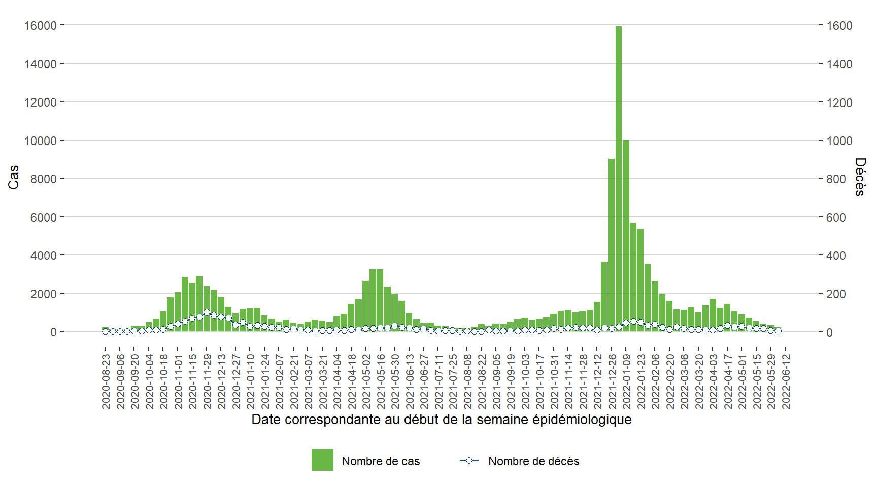 Figure 1. Cas de COVID-19 par semaine correspondante à la date du rapport de l’office de la santé publique du Manitoba du 23 août 2020 au 11 juin 2022