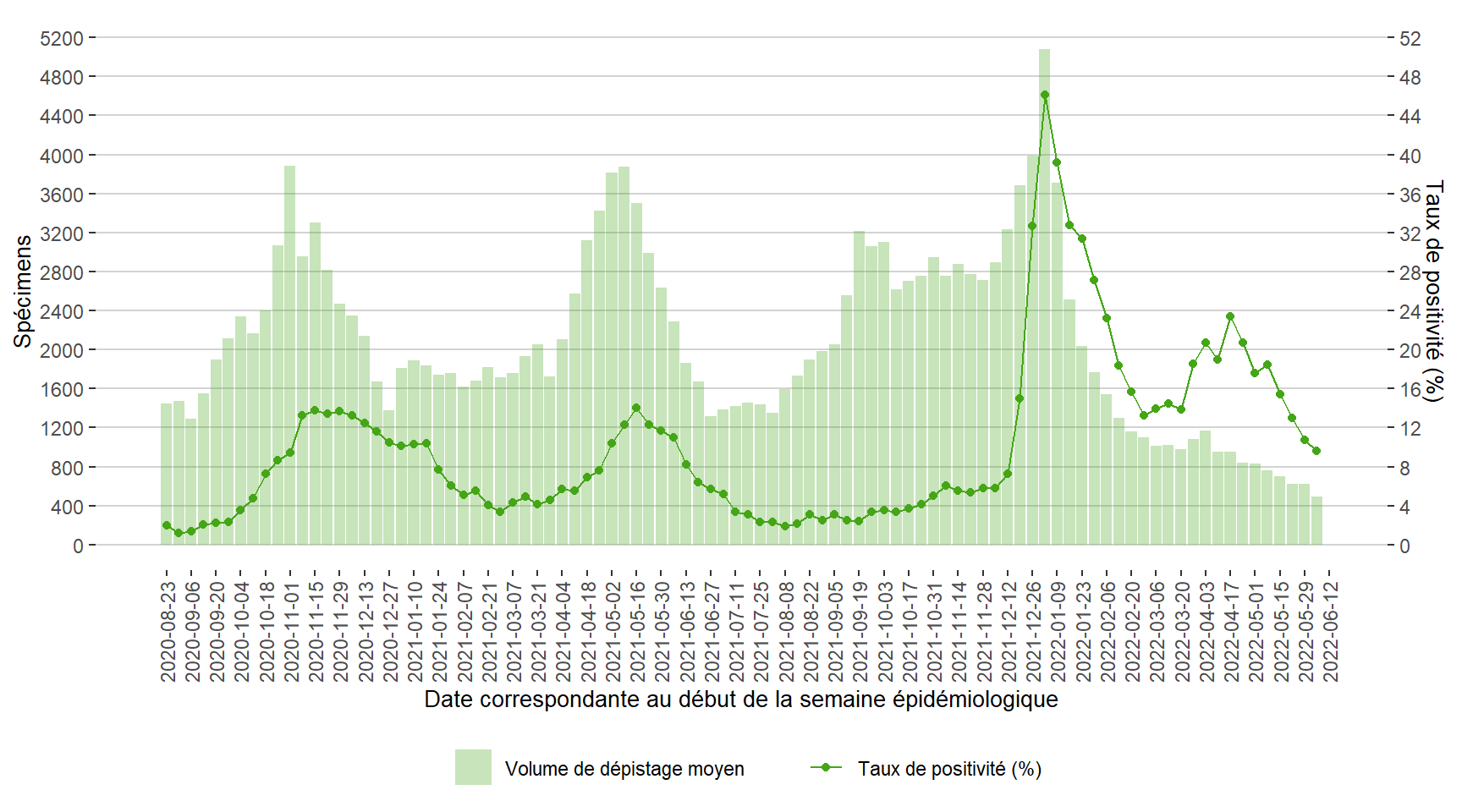 Figure 7. Volume de dépistage quotidien moyen et taux positivité (%) pour la COVID-19 correspondante à la semaine de réception des spécimens au Manitoba du 23 août 2020 au 11 juin 2022