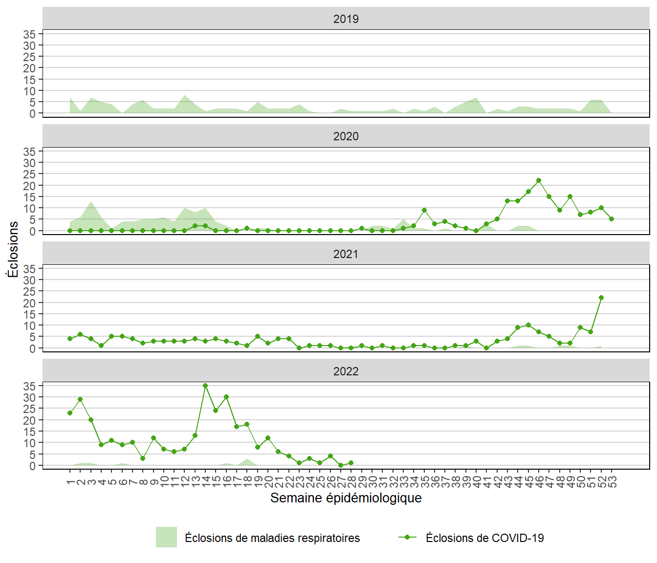 Figure 11. Éclosions de COVID-19 hebdomadaires au Manitoba du 2019 à 2022