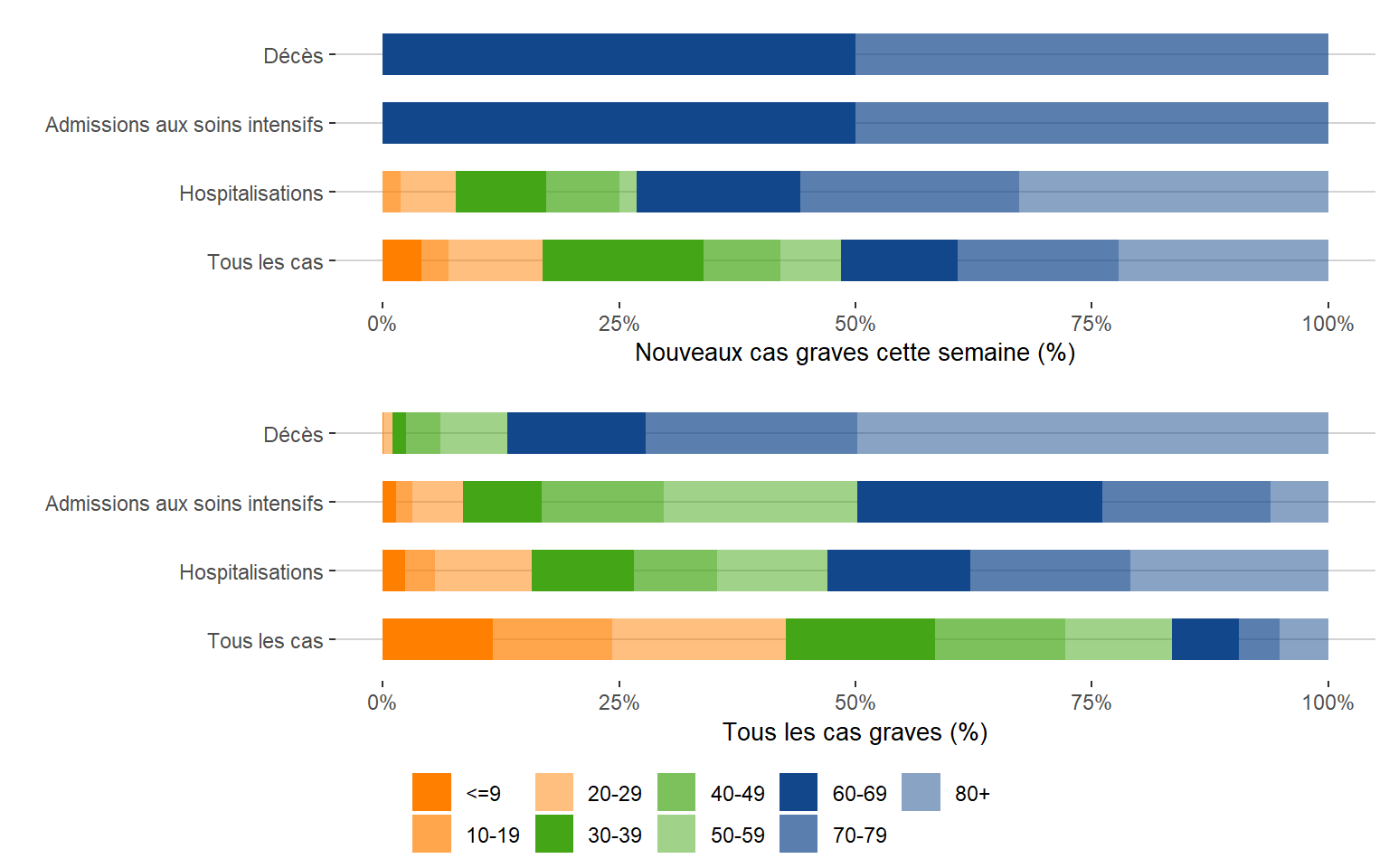 Figure 9. Répartition des cas graves de COVID-19 selon l’âge par rapport à tous les cas au Manitoba du 13 mars 2020 au 16 juillet 2022
