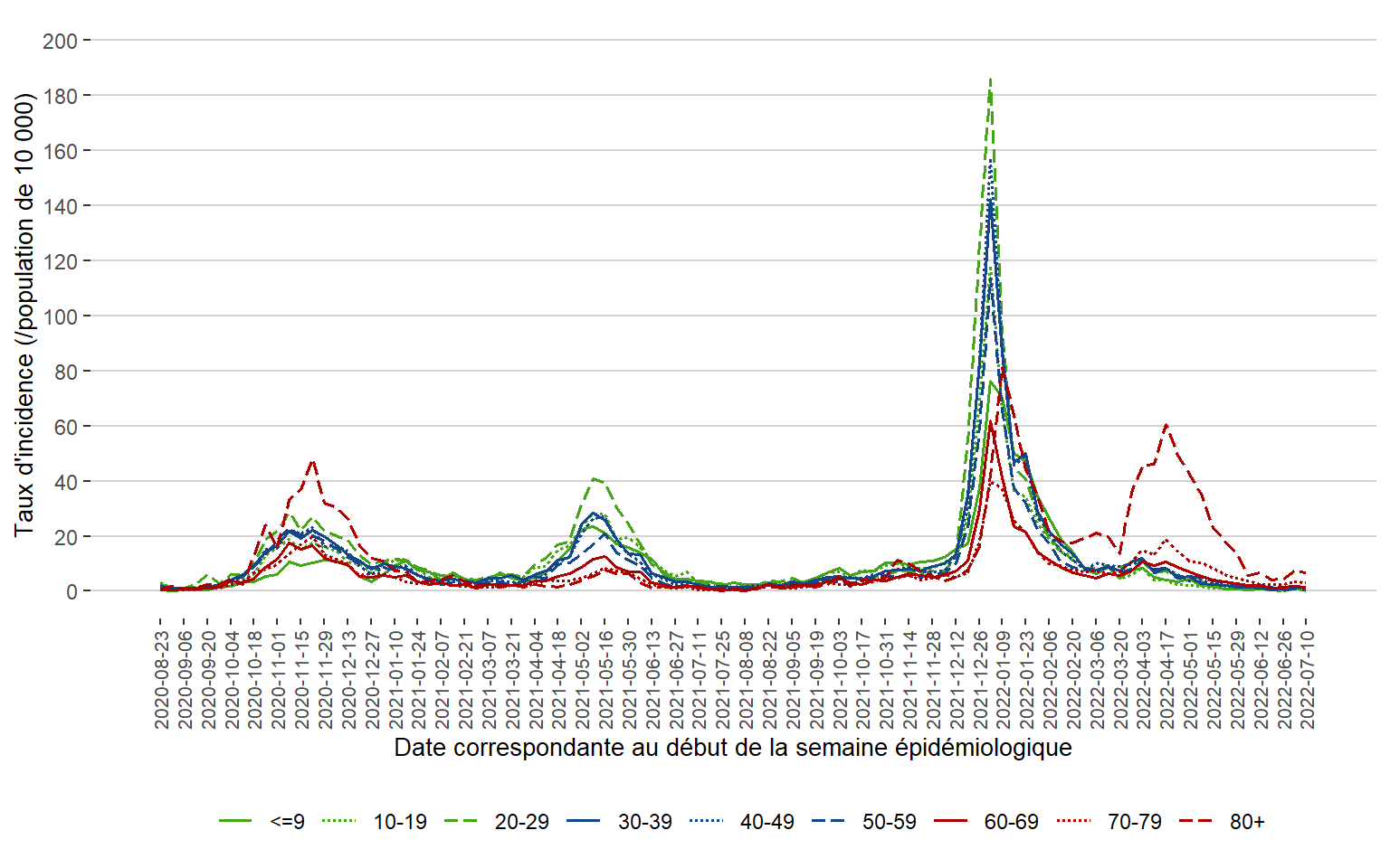 Figure 3. Taux d’incidence (/population de 10 000) des cas de COVID-19 par groupe d’âge et par semaine de date correspondante au rapport de l’office de la santé publique du Manitoba, du 23 août 2020 au 16 juillet 2022
