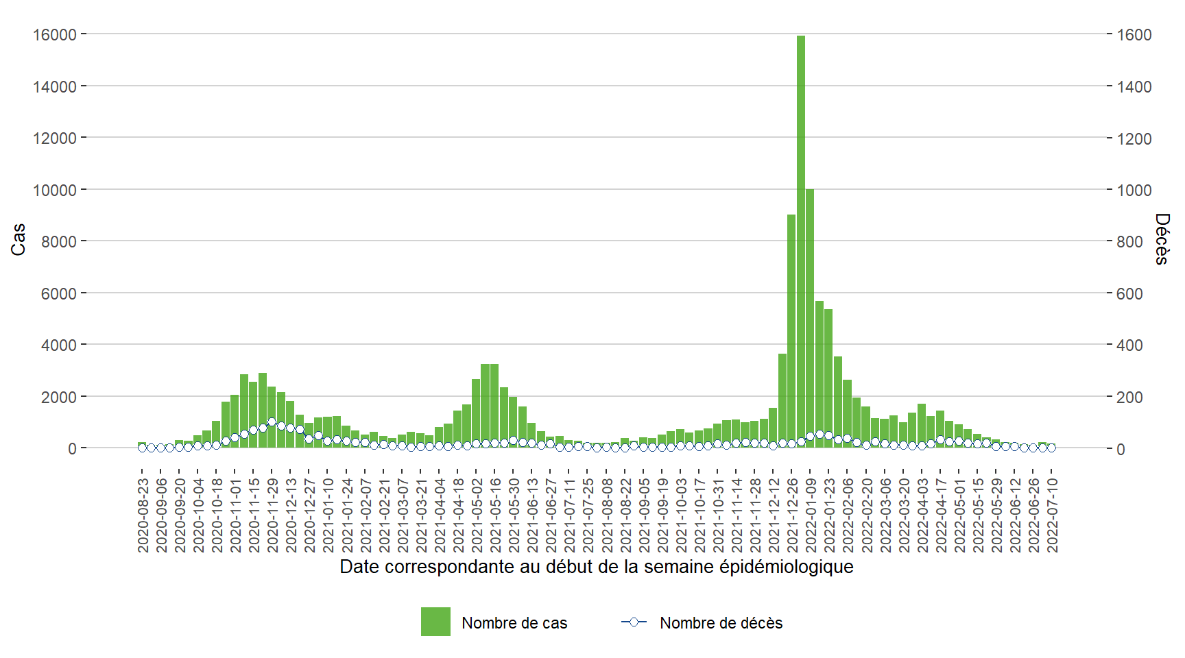 Figure 1. Cas de COVID-19 par semaine correspondante à la date du rapport de l’office de la santé publique du Manitoba du 23 août 2020 au 16 juillet 2022