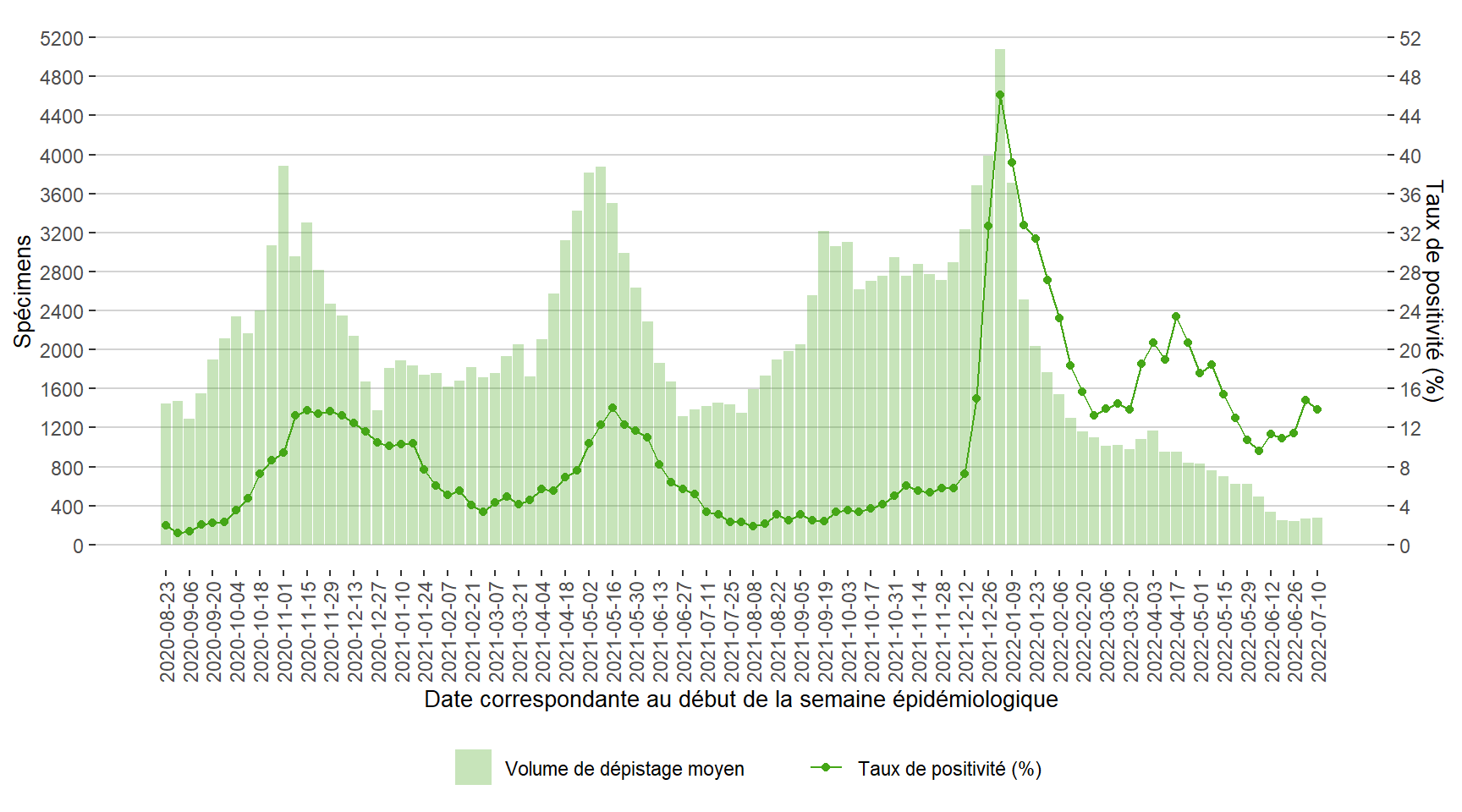 Figure 7. Volume de dépistage quotidien moyen et taux positivité (%) pour la COVID-19 correspondante à la semaine de réception des spécimens au Manitoba du 23 août 2020 au 16 juillet 2022