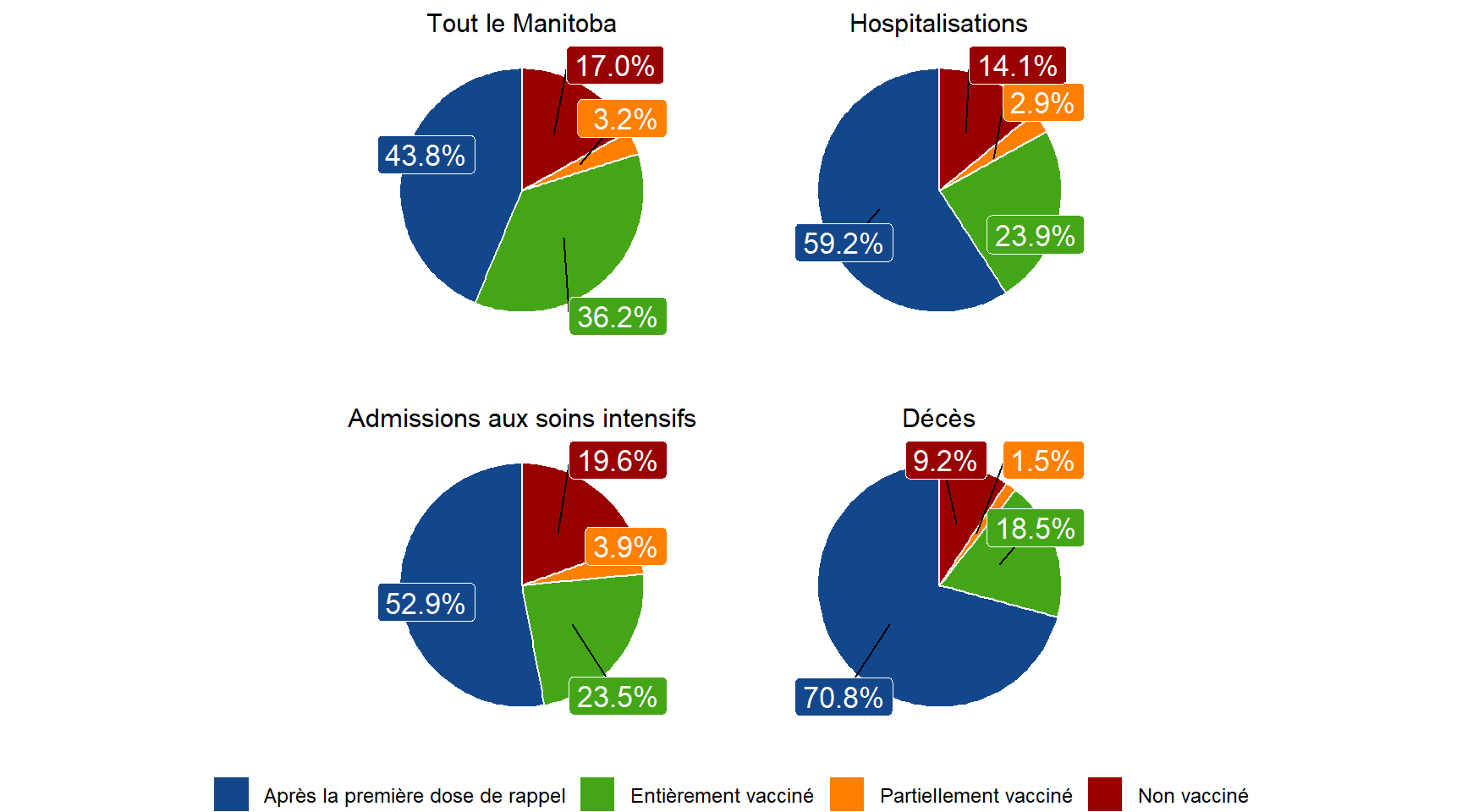 Cas non vaccinés : Personnes non vaccinées ou vaccinées de 0 à 13 jours après la première dose d’un vaccin contre la COVID-19. Cas partiellement vaccinés : Particuliers vaccinés >= 14 jours après la première dose d’une série de vaccins contre la COVID-19 de deux doses si une seule dose a été reçue et de 0 à 13 jours après la deuxième dose si les deux doses ont été reçues. Cas entièrement vaccinés : Personnes vaccinées >= 14 jours après la deuxième dose d’une série de deux doses ou la première dose d’une série d’une dose d’un vaccin contre la COVID-19. Après la première dose de rappel : Particulier vacciné >= 14 jours après une dose additionnelle suivant une série primaire complète.